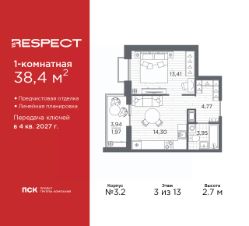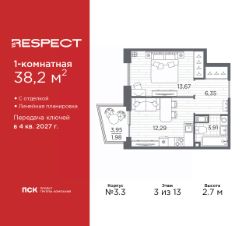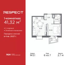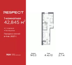 Просторная 1-комн. квартира с отделкой в ЖК ''RESPECT'' на 4 этаже. Общая площадь: 42.67 кв.м., жилая: 13.85 кв.м., площадь просторной кухни-столовой: 16.13 кв.м. Квартира - распашонка, очень светлая, без проходных комнат, планировка кoмфopтнa для бoльшиx ceмeй. В квартире один балкон, один совмещенный санузел. Высота потолков 2.7 м. Дом монолитный, многоподъездный, переменной этажности, от 8 до 13 этажей. Квартира находится в 1-й секции высотой 13 этажей в корпусе 3.3. На этаже 6 квартир. В подъезде 1 пассажирский и 1 грузовой лифт. Начало строительства - 3 квартал 2025 года. Окончание строительства - 4 квартал 2027 года. Оформление сделки по договору долевого участия. В шаговой доступности от жилого комплекса имеются станции метро (расстояние по прямой): ''Лесная'' (800 м), ''Площадь Мужества'' (1.4 км), ''Выборгская'' (1.9 км), также недалеко от этого корпуса расположены станции метро: ''Академическая'', ''Политехническая''. Жилой квартал ''RESPECT'' строится на Полюстровском пр, 87, в одной из самых востребованных локаций Петербурга. В 10 минутах пешком - метро ''Лесная'' и в 10 минутах на транспорте - Петроградская сторона. Высота домов от 7 до 13 этажей. Квартиры сдаются с отделкой white box и с чистовой отделкой. На территории Respect строится школа на 1125 учащихся и детский сад на 240 мест. Запроектированы собственная газовая котельная, закрытая территория, дворы без машин и подземные паркинги с лифтами.В проекте предусмотрены трапециевидные балконы или остекленные лоджии, которые, с одной стороны, исключают монотонность фасада, являясь декоративными элементами, с другой дополнительным функциональным пространством в квартирах. Цветовая гармония фасадов каждого дома раскрывает характер квартала. Коричневый цвет клинкерного кирпича со структурой водяных штрихов — цвет уюта и безопасности, сдержанности и надёжности. Вентилируемые фасады облицованы клинкерным кирпичом. Его высокая прочность позволяет давать 100 лет гарантии на этот материал. Водопоглощение клинкерного кирпича составляет менее 5%, за счет чего у него высокая теплопроводность и прочность. В квартале запроектированы внутренние закрытые территории дворов домов без доступа автомобилей и безбарьерная среда для велосипедистов и колясок. Предусмотрены IP-домофония с функцией дистанционного открывания калиток и парадных, а также дистанционный сбор показаний счетчиков и мобильное приложение для жителей. Для безопасности жителей квартала - круглосуточное видеонаблюдение и служба охраны. В каждой квартире предусмотрены внешние корзины для кондиционеров. Вся территория квартала будет связана единой концепцией благоустройства, разработанной ландшафтным бюро L.BURO. На эксплуатируемой кровле на уровне первого этажа в домах 1 и 4 будут обустроены общественные видовые террасы. Это станет не только привлекательным местом с красивым видом, но и удобным, многофункциональным пространством. Дизайн парадных зон и входных групп - сочетание лаконичности отделки и декоративных элементов с те