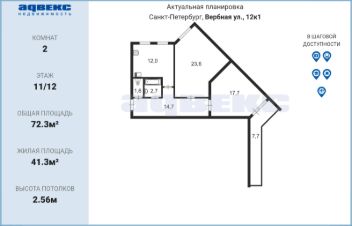 Просторная З-комнатная квартира в Санкт-Петербурге на Вербной улице, 12к1 ждет своих новых хозяев! Общая площадь — 81,9 кв.м, жилая — 42 кв.м. Квартира находится на 11 этаже кирпичного дома, построенного в 2003 году, всего в доме 13 этажей. Высота потолков — 2,6 метра. Окна выходят во двор, что обеспечивает тишину и уют. Тихие, спокойные соседи.В квартире частично сделан косметический ремонт. Расположение окон на северо-запад. Просторная кухня площадью 12 кв.м. В квартире есть балкон и лоджия, которые застеклены и утеплены (установлены двухкамерные стеклопакеты Rehau). Санузел раздельный, что обеспечивает дополнительное удобство для семьи.Дом оборудован грузовым и пассажирским лифтами, что исключает долгие ожидания. Наземная парковка позволяет без проблем найти место для автомобиля. Дом и подъезд в хорошем состоянии, поддерживаются в чистоте и порядке.В пешей доступности от дома расположены школы и детские сады, что будет удобно для семей с детьми. В 2-х минутах ходьбы находятся магазины Лента 24ч. и Перекресток 24ч. В доме расположено отделение почты России, Озон, Яндекс-маркет, зоомагазин, метизы, парикмахерская, ателье, магазин цветов, пиццерия.С боку от дома детская и взрослая поликлиники.Для любителей прогулок на природе в пешей доступности Орловский карьер, Шуваловский карьер, парк усадьбы Орловых-Денисовых, Мартыновский сквер с озером, парк Озеро Долгое, Удельный парк.До метро ''Удельная'' можно добраться на автомобиле всего за 4 минуты, пешком 25 минут, также много транспорта до метро Пионерская, Комендантский проспект, Старая деревня, что делает транспортную доступность очень удобной.Квартира продается по договору купли-продажи. Возможно оформление ипотеки.По всем вопросам звоните, буду рада помочь.Просмотры по предварительной договорённости в удобное время.