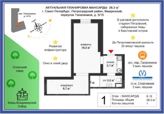Продаётся атмосферная мансарда на Петроградской стороне !— Дом не является памятником архитектуры. — У объекта есть свой кадастровый номер. Это не переделанная коммуналка с ''картонными'' межкомнатными перекрытиями.Лифта Нет! Юридический статус: нежилое помещение.— В комплекте с квартирой — кладовка. — 28,3 м² по документам, по факту 32 кв.м Объект расположен на последнем этаже с видом на крыши Петербурга. Отличное местоположение: в шаговой доступности метро Спортивная, Князь-Владимирский собор, Юбилейный, стадион Петровский, набережная Невы и Крестовский остров. Район с насыщенной инфраструктурой, удобный для жизни и аренды. По документам: 1 взрослый собственник. без обременений. полная цена в договоре. Звоните — расскажу подробнее и организую просмотр.