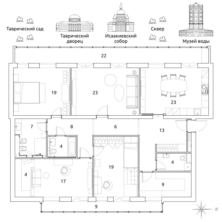 Арт. 127273639 Перспективная просторная квартира с жилым статусом и окнами на зелёный сквер и памятник Александру II. Дамы и господа, представляем Вам квартиру в лучшей части Суворовского проспекта - прямо напротив Николаевской академии. Локация действительно желанная: в нескольких минутах пешком - Таврический и Некрасовский сады, поблизости - фешенебельные рестораны итальянской, французской, русской кухни, статусные бутики и уютные кафе. Рядом с Вами - Невская ратуша - целый квартал престижной деловой застройки. Неподалёку на улицах Моисеенко, Новгородской возводятся клубные дома элит.класса, а Парадная и Кирочная уже давно ассоциируются с престижной недвижимостью. Между тем, дорога до всех достопримечательностей Центрального района займет у Вас не больше 30 минут по красивейшим местам города. Привыкли заниматься пробежкой вдоль воды? Без проблем: набережные Большой Невы с захватывающими дух видами в километре от Вас. И Вам не докучают толпы туристов, или завсегдатаи Рубинштейна! Здесь действительно лучшее место для жизни. Дом 1891 года постройки. Перекрытия - железные балки с деревянным наполнением, однако собственники квартиры, в процессе ремонта, проводили оценку состояния перекрытий и делали всё необходимое для создания качественной базы. Отличная, перспективная планировка квартиры даёт классные возможности для обустройства Вашей большой семейной двусторонней резиденции. 5 огромных окон в тихий зелёный просторный двор - так и просятся две спальни, одна из которых со своим санузлом, и два окна с видом на Суворовский и Николаевскую академию идеально подойдут для устройства большой кухни-гостиной. В квартире два стояка, а снизу - тихая коммерция (косметология). Повторюсь, здесь отличная база, свежие коммуникации и электрика. По документам потолки - 3.12 м, но боюсь, здесь какая-то ошибка: потолки в квартире невероятно высокие и создаётся то самое неповторимое ощущение благородного пространства, возникающее, пожалуй, только в старом фонде. Прямая продажа. Документы готовы к сделке. Внимание! В презентации объекта представлена визуализация готового интерьера на основании фотографий. --------- Третий круг по Таврическому. Жара не смотря на ранее утро. Пульс зашкаливает. Срезаете через мостики, с непреодолимым желанием плюхнуться в спасительную прохладу этого пруда. ''Завтра побегу по Воскресенской набережной'', думаете Вы, с завистью глядя на бутылки воды у ног занимающихся йогой на траве. Вы выбегаете на Таврическую, с ухмылкой замечаете название фешенебельного салона для животных ''Собачья жизнь''...Миновав итальянское бистро и отогнав мысли об ещё более жарком солнце Италии Вы оказываетесь в Вашей любимой французской булочной рядом с домом. Ледяной кофе по дороге до Вашей квартиры. Спасительная прохлада парадной. Высокий второй этаж. Открытые настежь окна, сквозняк, терзающий шторы и дающий фору любому кондиционеру. Наконец, спасительный ледяной душ. Вы наконец-то приходите в себя. Проходя мимо окна, бросаете взгляд на скульптуру императо