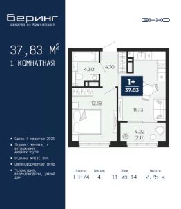 1-комн. квартира с предчистовой отделкой в ЖК ''Беринг'' на 11 этаже. Общая площадь: 37.83 кв.м., жилая: 12.19 кв.м., площадь просторной кухни-столовой: 15.13 кв.м. Все окна выходят на одну сторону. В квартире одна лоджия, один совмещенный санузел. Высота потолков 2.75 м. Дом монолитный, многоподъездный, переменной этажности, от 9 до 21 этажей. Квартира находится в 4-й секции высотой 14 этажей в корпусе ГП-74. На этаже 7 квартир. В подъезде 1 пассажирский и 1 грузовой лифт. Окончание строительства - 1 квартал 2026 года. Оформление сделки по договору долевого участия. Подобно знаменитому исследователю, мы чувствуем себя первооткрывателями этой локации. Хотим показать новую суть места, сформировать для вас жизненный опыт, которого ещё не было. Беринг — район зелёного цвета. Беринг — район, который откроется вам с другой стороны. Впечатлит новым уровнем комфорта и качеством жизни. Беринг — открытие на карте города. Первый квартал расположен в районе Тура, в границах улиц: Камчатская Западносибирская Энтузиастов. Вокруг уже есть всё для того, чтобы ежедневная рутина была лишь частью жизни и не доставляла дискомфорта.Школы и детские сады, магазины и аптеки, поликлиника, места для семейного отдыха, пеших и велопрогулок, и даже рыбалки. Масштабное озеленение дворов — визитная карточка ЭНКО и ваш оазис спокойствия, чтобы отвлечься от повседневности. Раскидистые деревья, кустарники, травы и цветы — осталось остановиться, вдохнуть и расслабиться, глядя на эту природную красоту. Стилистика подъездов продолжает концепцию Беринга, вдохновлённого Камчаткой: сдержанный,но при этом впечатляющий дизайн соседствует с удобством и функциональностью. #2USS9t