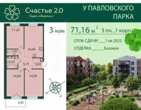 Квартира 66 в малоэтажном районе Счастье 2.0 - это особое, продуманное до мелочей, пространство для жизни в одном из самых живописных районов Санкт-Петербурга, в непосредственной близости от дворцово-паркового ансамбля Павловска. Все составляющие квартала направлены на максимальный комфорт его жителей: оригинальная архитектура, закрытые и безопасные дворы, современные планировки квартир, великолепная природа южного пригорода в сочетании с развитием собственной коммерческой и социальной инфраструктуры. Срок сдачи - 1 кв. 2025 года
