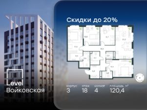 Цена указана с учётом скидки при 100%-й оплате, несубсидированной ипотеке, рассрочке (кроме программы ''Рассрочка 0%'').Продается 3-комнатная квартира площадью 91.80 кв. м без отделки. Квартира находится на 6 этаже 20-этажного корпуса 3, в новом жилом комплексе бизнес-класса Level Войковская, расположенном рядом с живописным заповедником ''Покровское-Стрешнево'' (застройщик - компания Level Group/Левел групп).Прекрасная транспортная доступность- 7 мин. пешком до станции МЦК ''Балтийская'',- 15 мин. пешком до станции метро ''Войковская'',- 8 мин. на машине до ТТК,- 15 мин. на машине до центра Москвы,- 20 мин. на машине до Москва-Сити. Продуманный архитектурный проект- стильная архитектура от мастерской Фефелова В. В.,- панорамные виды на парки, Химкинское водохранилище и Останкинскую башню,- лобби с высотой потолков до 6,45 метров,- более 20 видов планировочных решений, включая редкие форматы квартир с террасой и увеличенной высотой потолков до 5,42 метров,- 2 варианта дизайнерской отделки в корпусе 4, предлагаются как дополнительная опция к отделке white box: стиль Modern в светлых холодных тонах и стиль Classic в нейтральной бежевой гамме. Квартиры в корпусах 3 и 5 сдаются без отделки. РасположениеLevel Войковская строится в престижном Северном округе Москвы. Развитая инфраструктура и живописная природа переплетаются в единый ансамбль, столь значимый для комфортной жизни.Войковский район окружают парки и набережные. В шаговой доступности - парк ''Покровское-Стрешнево'', не более 15-ти минут на велосипеде занимает путь до Тимирязевского парка и 9-ти минут до парка усадьбы Михалково.Рядом более 60 школ, 75 дошкольных учреждений, 17 государственных и 6 частных вузов, 25 супермаркетов, 4 торговых центра, среди которых ТЦ ''Метрополис'' и ТЦ ''Авиапарк''. Внутренняя инфраструктураНа территории жилого комплекса предусмотрены коммерческие помещения: кафе, ресторан, пекарня и другие сервисы откроются на первых этажах корпусов. Для жителей будет доступен отапливаемый подземный паркинг на 244 машино-места с доступом с любого этажа на лифте. На территории паркинга будет расположено 125 кладовых помещений для хранения сезонного инвентаря. Лобби и благоустройствоДизайн лобби Level Войковская создан совместно с бюро BLANK. Это уютные гостиные, где хочется задержаться. Теплая цветовая гамма, ресепшен, зоны ожидания, лапомойки и гостевые санузлы - каждая деталь превращает лобби в комфортное продолжение вашего дома.1,15 га площади в первых двух этапах строительства отведено под приватный внутренний двор, который спроектирован совместно с бюро ''Правда''. Детские площадки для всех возрастов, спортивные пространства для йоги, воркаута и петанка, уютные зоны для тихого отдыха или работы. Здесь утро начинается с вдохновения, а вечер наполнен приятными моментами. ЛифтыКомфортное перемещение внутри жилого комплекса будут обеспечивать надёжные лифты с доступом в паркинг с жилых этажей. В каждом корпусе предусмотрено по 3 грузопассажирских лифта.