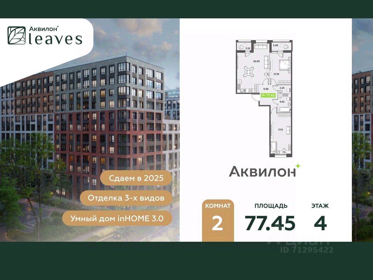 Купи квартиру в ЖК ''Аквилон Leaves''! Отделка В квартире выполнена предчистовая отделка WhiteBox +Возможен дозаказ отделки в любом из 3 цветов: SAND, TERRA, GRAPHITE Отделка входит в стоимость квартиры в ДДУ ЖК ''Аквилон Leaves'' Жилой комплекс класса бизнес-лайт ''Аквилон Leaves'' воплощает идеальную синергию природы, технологий и дизайна. В одном из самых престижных районов Санкт-Петербурга мы создаем функциональную жилую среду, которая позволит максимально быстро и удобно решать бытовые вопросы, сохраняя ценное время для семьи и любимых занятий. -Малошумные лифты -Сквозные парадные -Светопрозрачные входные группы -Увеличенная высота первого этажа -Безбарьерная среда -Подземный паркинг Стандарты Группы Аквилон для вашей комфортной жизни Thermo-S экономия на коммунальных платежах за счет дополнительно утепленных стен, кровли и цоколя. Энергоэффективные окна с селективным покрытием и аргоновым заполнением Soundstop - дополнительная шумоизоляция внутренних перегородок и межэтажных перекрытий, шумозащитные окна, малошумные лифты Light-in - в квартирах устанавливаются широкоформатные окна, увеличены на 30%. Высота подоконников на уровне 60 см от пола. Vent-in - в каждой комнате есть клапаны индивидуальной вентиляции, которые обеспечивают приток свежего воздуха с улицы. inHOME умный дом в каждой квартире Интеллектуальная цифровая система, которая позволит дистанционно решать бытовые вопросы, управлять квартирой и экономить на оплате коммунальных услуг. В состав inHOME входят: IP-домофон, Face key, ''умные'' счетчики, датчики протечки, дистанционное отключение розеток, и т.д. Двор ваш личный парк Благоустройство двора от студии ландшафтного дизайна MEGABUDKA отсылает нас к образу зеленого листа. Современная архитектура гармонирует с окружающей средой, а экологические стандарты и ''умные'' системы обеспечивают ежедневный комфорт. -Зонирование на площадки для активного и спокойного отдыха. -Ландшафт с геопластикой и рельефом напоминает естественную красоту природных парков. -Всесезонные растения -Высаживаются взрослые деревья и кустарники Локация и инфраструктура Помимо разнообразной инфраструктуры, рядом с комплексом расположен Пулковский парк и сад ''Дубовая роща''. У жителей будут все возможности для отдыха на свежем воздухе. Велопрогулка, пробежка или летний пикник наслаждайтесь природой, не уезжая далеко загород. -10 мин. до м. Московская -15 мин. до м. Звездная -15 мин. до аэропорта Пулково -30 мин. до Невского пр. #25d0D4