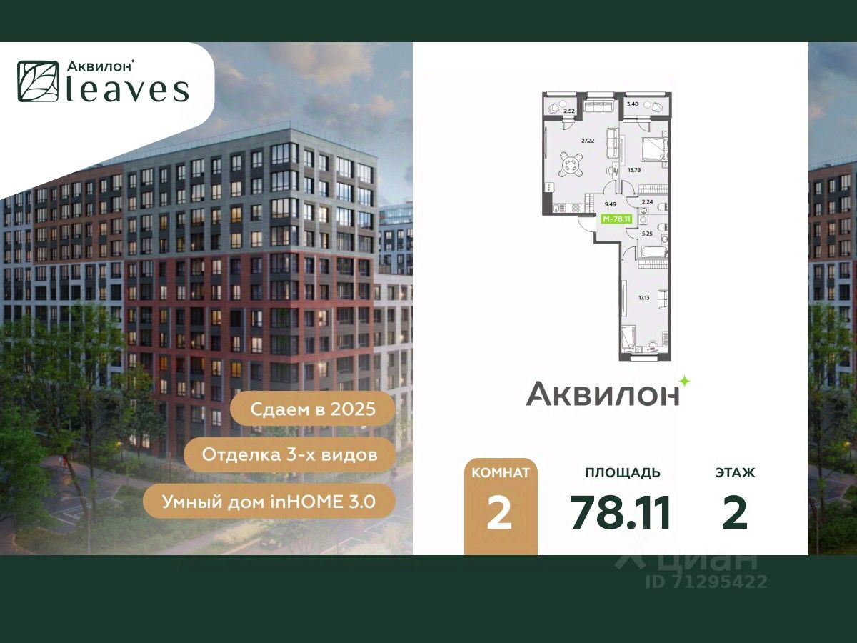 Купи квартиру в ЖК ''Аквилон Leaves''! Отделка В квартире выполнена предчистовая отделка WhiteBox +Возможен дозаказ отделки в любом из 3 цветов: SAND, TERRA, GRAPHITE Отделка входит в стоимость квартиры в ДДУ ЖК ''Аквилон Leaves'' Жилой комплекс класса бизнес-лайт ''Аквилон Leaves'' воплощает идеальную синергию природы, технологий и дизайна. В одном из самых престижных районов Санкт-Петербурга мы создаем функциональную жилую среду, которая позволит максимально быстро и удобно решать бытовые вопросы, сохраняя ценное время для семьи и любимых занятий. -Малошумные лифты -Сквозные парадные -Светопрозрачные входные группы -Увеличенная высота первого этажа -Безбарьерная среда -Подземный паркинг Стандарты Группы Аквилон для вашей комфортной жизни Thermo-S экономия на коммунальных платежах за счет дополнительно утепленных стен, кровли и цоколя. Энергоэффективные окна с селективным покрытием и аргоновым заполнением Soundstop - дополнительная шумоизоляция внутренних перегородок и межэтажных перекрытий, шумозащитные окна, малошумные лифты Light-in - в квартирах устанавливаются широкоформатные окна, увеличены на 30%. Высота подоконников на уровне 60 см от пола. Vent-in - в каждой комнате есть клапаны индивидуальной вентиляции, которые обеспечивают приток свежего воздуха с улицы. inHOME умный дом в каждой квартире Интеллектуальная цифровая система, которая позволит дистанционно решать бытовые вопросы, управлять квартирой и экономить на оплате коммунальных услуг. В состав inHOME входят: IP-домофон, Face key, ''умные'' счетчики, датчики протечки, дистанционное отключение розеток, и т.д. Двор ваш личный парк Благоустройство двора от студии ландшафтного дизайна MEGABUDKA отсылает нас к образу зеленого листа. Современная архитектура гармонирует с окружающей средой, а экологические стандарты и ''умные'' системы обеспечивают ежедневный комфорт. -Зонирование на площадки для активного и спокойного отдыха. -Ландшафт с геопластикой и рельефом напоминает естественную красоту природных парков. -Всесезонные растения -Высаживаются взрослые деревья и кустарники Локация и инфраструктура Помимо разнообразной инфраструктуры, рядом с комплексом расположен Пулковский парк и сад ''Дубовая роща''. У жителей будут все возможности для отдыха на свежем воздухе. Велопрогулка, пробежка или летний пикник наслаждайтесь природой, не уезжая далеко загород. -10 мин. до м. Московская -15 мин. до м. Звездная -15 мин. до аэропорта Пулково -30 мин. до Невского пр. #Z3cdDD