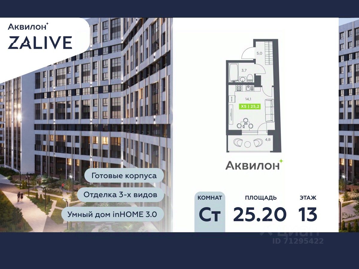 Купи квартиру в ЖК ''Аквилон ZALIVE''! Отделка В квартире выполнена предчистовая отделка WhiteBox +Возможен дозаказ отделки в любом из 3 цветов: SAND, TERRA, GRAPHITE Отделка входит в стоимость квартиры в ДДУ ЖК ''Аквилон ZALIVE'' Жилой комплекс ''Аквилон ZALIVE'' расположился в уникальной части престижного Васильевского острова. С одной стороны рядом деловой и исторический центр, с другой берег Финского залива и новая современная инфраструктура в пешей доступности. Проект включает в себя пять тринадцатиэтажных ''умных'' домов в едином архитектурном стиле. Насыщенная социальная инфраструктура, инновации в каждой квартире, стильное благоустройство территории и видовые характеристики это лишь часть уникальных преимуществ жилого комплекса ''Аквилон ZALIVE''. -Малошумные лифты -Сквозные парадные -Светопрозрачные входные группы -Школа во дворе -Безбарьерная среда -Паркинг Стандарты Группы Аквилон для вашей комфортной жизни Thermo-S экономия на коммунальных платежах за счет дополнительно утепленных стен, кровли и цоколя. Энергоэффективные окна с селективным покрытием и аргоновым заполнением Soundstop - дополнительная шумоизоляция внутренних перегородок и межэтажных перекрытий, шумозащитные окна, малошумные лифты Light-in - в квартирах устанавливаются широкоформатные окна, увеличены на 30%. Высота подоконников на уровне 60 см от пола. Vent-in - в каждой комнате есть клапаны индивидуальной вентиляции, которые обеспечивают приток свежего воздуха с улицы. inHOME умный дом в каждой квартире Интеллектуальная цифровая система, которая позволит дистанционно решать бытовые вопросы, управлять квартирой и экономить на оплате коммунальных услуг. В состав inHOME входят: IP-домофон, Face key, ''умные'' счетчики, датчики протечки, дистанционное отключение розеток, и т.д. Двор ваш личный парк Для разработки проекта благоустройства и озеленения Группа Аквилон привлекла студию DEREVO PARK, которую ассоциация ландшафтных архитекторов России четыре года подряд признавала лучшей. Два хвойных сада, расположенные вдоль западной стороны квартала, станут визитной карточкой ЖК ''Аквилон ZALIVE''. Локация и инфраструктура Васильевский остров это море и прогулки, Санкт-Петербургский Государственный Университет и Ростральные колонны, музей современного искусства ''Эрарта'' и концептуальное пространство ''Севкабель Порт''. Достаточно переехать через мост и вот вы уже в центре или на Петроградской стороне. - 7 мин. до развязки ЗСД -12 мин. до м. Приморская -15 мин. до м. Невский проспект #24sCU2
