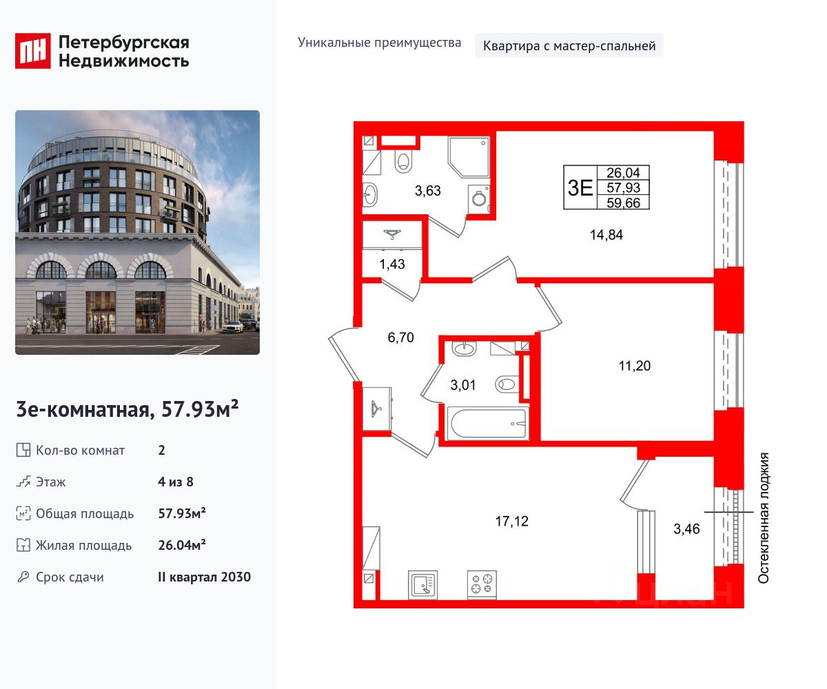 Продается уютная 2-комнатная квартира от застройщика в жилом комплексе ''Аристократ'' в уютном Василеостровском районе. До метро можно добраться пешком всего за 10 минут. Мастер-спальня с собственной ванной комнатой. Самое приватное пространство в вашей квартире. Уникальная, функциональная европланировка, большая кухня-гостиная 17.12 м², вместительная прихожая 6.7 м². Общая площадь квартиры - 57.93 м², жилая 26.04 м², высота потолка 2.7 м. Квартира продается с отделкой ''Норд Лайн бизнес''. Что особенного в ЖК ''Аристократ''? • Премиальная отделка квартир - Норд Лайн бизнес • Васильевский остров - историческая локация с современными культурными кластерами • Индивидуальный облик каждого корпуса в единой архитектурной концепции • 7 парадных лобби с потолками до 7-ми метров • Цветущие сады, зеленые гостиные, фонтаны • Клуб резидентов ''Аристократ'': фитнес-клуб, коворкинг, гостиная с роялем, детский центр с кинотеатром • Технологичная среда на территории, в доме и в квартире