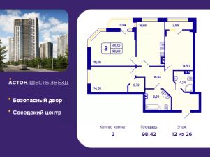 Успейте оформить бронирование, пока действует скидка! Предложение ограничено! Стоимость квартиры указана со скидкой, ваша экономия составит 1,150,000 RUB. Квартиру можно купить по семейной ипотеке. Звоните, наши менеджеры вам все расскажут! Трехкомнатная квартира с предчистовой отделкой в ЖК ''Астон. Шесть Звезд'' на 15 этаже. Общая площадь: 97.95 кв.м., жилая: 48.66 кв.м., площадь просторной кухни-столовой: 16.42 кв.м. Квартира угловая, очень светлая, естественная вентиляция при открытии окон. В квартире одна лоджия, два совмещенных санузла. Высота потолков 2.65 м. Квартира находится в корпусе 2Б. Дом монолитный, одноподъездный, высотой 26 этажей. На этаже 7 квартир. В подъезде 5 грузовых лифтов. Окончание строительства - 4 квартал 2026 года. Оформление сделки по договору долевого участия. ''Астон.Шесть звезд'' - современный комплекс из 26-этажных домов класса ''комфорт плюс'' с уютными квартирами, вдохновляющими видами на левобережье, продуманной организацией жилого пространства, стильным дизайном общественных интерьеров и авторским благоустройством. Природа рядом, для этого ненужно ехать далеко загород. В районе жилого комплекса расположен парк Бугринская роща, в котором есть масса развлечений для вас и вашей семьи:- парк аттракционов- кемпинг ''Бугринская гавань'' с зонами барбекю- зимний каток и зона для катания на снегоходах- лыжная база ''Сибирь''- летом благоустроенный пляж В 10 минутах ходьбы находится большой футбольный стадион, также поблизости есть конный клуб ''Мустанг''. В пределах 15 минут езды на общественном транспорте расположены учебные заведения - Новосибирский Государственный Технический Университет, Сибирский университет потребительской кооперации и колледжи. Фасады жилого комплекса - воплощение современного стиля. Такой эффект дает сочетание строгих линий, благородных оттенков натуральных материалов и блеска вертикального витражного остекления. Авторский дизайн холлов сочетает натуральные оттенки и фактуры дерева, керамогранита, декоративной штукатурки. Обилие света и воздуха создает сочетание стеклянных и зеркальных элементов со стильной трековой подсветкой, дополненной акцентнвми бра. Мягкие зоны в таком антураже особенно уютны и удобны для коротких встреч или ожидания курьера. Квартира будет просторнее, если оставить коляску, велосипед или игровой инвентарь в колясочной с удобными полками. Хранить не сезонные вещи можно в личной кладовой. Благоустроенный закрытый двор спроектирован с учетом безопасности и многофункциональности пространства - здесь можно поиграть с детьми, заняться спортом или просто отдохнуть в парковой зоне. Центром притяжения в ''Астон.Шесть звезд'' станет современный и функциональный комьюнити-центр. Это не просто модное слово, а забота о комфорте и хорошем настроении жителей комплекса. Здесь можно спокойно поработать утро, встретиться с соседями за чашкой чая или провести небольшое мероприятие. #zm32OB