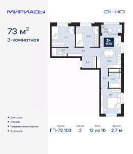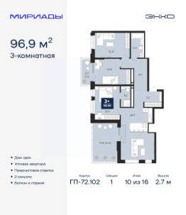 Продается трехкомнатная квартира от застройщика с предчистовой отделкой в ЖК ''Мириады'' на 10 этаже. Общая площадь: 96.9 кв.м., жилая: 40.2 кв.м., площадь просторной кухни-столовой: 26.7 кв.м. Угловая квартира, очень светлая, естественная вентиляция при открытии окон. В квартире один балкон и одна лоджия, два совмещенных санузла. Терраса представляет собой роскошную зону отдыха для проведение вечеров в кругу семьи и друзей или организация вечеринок. Высота потолков 2.7 м. Дом монолитный, многоподъездный, переменной этажности, от 14 до 16 этажей. Квартира находится в 1-й секции высотой 16 этажей в корпусе ГП-72.102. На этаже 9 квартир. В подъезде 1 пассажирский и 1 грузовой лифт. Строительство окончено, дом сдан в 4 квартале 2025 года. Оформление сделки по договору купли-продажи. Вселенная бесконечных историй. Ранее невиданный Тюмени масштаб: территория 240 гектаров и 1 650 000 м² застройки. Мириады это город масштабных перемен и больших возможностей. Город зеленых рощ и зеркальных озер. Город для работы, учебы и развлечений. Город для детей и их родителей. Город для всех и каждого. Проект расположен в районе Мыс рядом с ТРЦ ''Тюмень Сити Молл'' в границах улицы Тимофея Чаркова, Тобольского тракта и объездной дороги. Срок полного освоения территории - до 2034 года. #2MTeVt