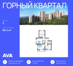 В продаже 3-комнатная квартира площадью 80.4, расположенная Литер 4 жилого комплекса комфорт+ класса ''Горный квартал''. Комплекс от девелопера AVA находится в Сочи, Хостинского района, в 15 минутах езды от центра города.Отличная транспортная доступность:Остановка маршрутных такси - 5 минут пешком,Барановский виадук - 10 минут на авто,Министерские озера - 2 минуты пешком,Гимназии, детские сады, фитнес-центры, супермаркеты, кинотеатр - 5-10 минут на авто,Ж/Д и автовокзал - 15-20 минут на авто,Адлер - 30 минут на авто,Аэропорт - 45 минут на авто.Аккуратный облик домовЖилой комплекс состоит из пяти корпусов высотой от 10 до 16 этажей. Сдержанные фасады в бежево-серых оттенках выглядят аккуратно и гармонируют с природным окружением, а открытые балконы добавляют облику домов легкости. Контейнеры под кондиционеры встроены в фасады и практически незаметны, благодаря чему дома сохраняют опрятный внешний вид. Комплекс расположен на склоне горы, поэтому из окон квартир на верхних этажах открываются отличные панорамные виды на лес, озеро и город: чем выше этаж, тем выразительнее пейзаж.Двор, где есть место для всехНа внутренней территории комплекса всем будет приятно и интересно проводить время в любой сезон. Здесь есть беседки и гамаки под теневыми навесами, что особенно удобно для отдыха в жаркие или дождливые дни. Для активных жителей предусмотрены спортивные площадки и уличные тренажеры, для детей - игровые площадки из натуральных материалов, а для семей и компаний - зона барбекю. Особое преимущество - кинотеатр под открытым небом: формат редкий для жилых комплексов и особенно ценный для совместного семейного досуга прямо рядом с домом. Во всем дворе - ландшафтное озеленение: высажены разнообразные деревья и кустарники, южные цветы и газоны.Природное окружение и идеальная экологияЛокация особенно понравится тем, кто любит природу и ведет активный образ жизни. Всего в 2 минутах ходьбы находится Нижнее Министерское озеро - отличное место для прогулок и отдыха. Поблизости расположены природные достопримечательности южного побережья, включая Черепашье озеро и дольмены, куда интересно ходить в походы или выезжать на выходные. До общественных и санаторных пляжей можно добраться за 20 минут на автомобиле. Благодаря хвойному лесу и мягкому морскому бризу здесь всегда чистый воздух, а ночами видно звездное небо, что подчеркивает горный характер места и создает редкое ощущение тишины и уюта для Сочи.Дополнительные преимуществаВидовые квартиры с окнами на три стороны света и семейные форматы с тремя спальнями, двумя ванными и отдельной кухней,Наземный паркинг для жителей и гостей на 815 машиномест,На первых этажах домов работают магазины, рестораны и салоны красоты, к которым можно спуститься на лифте,Комфортно не только отдыхать, но и полноценно жить всей семьей: гимназии в 10 минутах езды, удобная дорогая до города, магазины и сервисы поблизости.