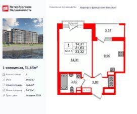 Продается уютная 1-комнатная квартира от застройщика в жилом комплексе ''Setl Ривьера'' в активно развивающимся Невском районе.До метро можно добраться на транспорте всего за 10 минут.Французский балкон придает особенный европейский шик комнате.Уникальная планировка, кухня 9.9 м², вместительная прихожая 3.8 м². Общая площадь квартиры - 31.63 м², жилая 14.31 м², высота потолка 2.77 м.Квартира продается с отделкой ''NORD LINE SILVER ВК NEW''.Что особенного в ЖК ''Setl Ривьера''?• Первая береговая линия Невы. 5 км до центра Петербурга• ''Активити парк'' - пространство для занятий спортом и отдыха. ''Ривьера парк'' с променадом и панорамной ротондой• Масштабные дворы 10 000 кв.м. с авторским ландшафтным дизайном• Двухуровневые единые входные группы• Видовые квартиры с террасами, каминами и саунами