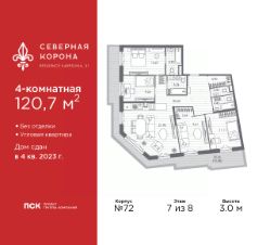 4-комн. квартира от застройщика в ЖК ''Северная корона'' на 7 этаже. Квартира без отделки, после выдачи ключей можно делать ремонт. Общая площадь: 120.7 кв.м., жилая: 43.63 кв.м., площадь просторной кухни-столовой: 21.98 кв.м. Угловая квартира, идеально подойдет любителям тишины и панорамных видов. В квартире один балкон, три совмещенных и один раздельный санузел. Наличие террасы размером 32.26 кв.м. в квартире открывает возможность для обустройства дополнительной площади. Высота потолков 3.0 м. Квартира находится в корпусе 7.2. Дом монолитный, одноподъездный, высотой 8 этажей. На этаже 4 квартиры. В подъезде 1 грузовой лифт. В настоящее время строительство завершено, дом сдан в 4 квартале 2023 года. Оформление сделки по договору купли-продажи. В шаговой доступности от жилого комплекса имеются станции метро (расстояние по прямой): ''Петроградская'' (500 м), ''Чкаловская'' (1.3 км), ''Горьковская'' (1.7 км), ''Чёрная речка'' (1.7 км), также недалеко от этого корпуса находятся станции метро: ''Чернышевская'', ''Спортивная''. Премиальный жилой комплекс ''Северная корона'' расположился в парадной части Петроградской стороны на пересечении ее главного проспекта — Каменноостровского и набережной реки Карповки.Двухсотметровое парадное лобби, дизайнерский ландшафт, собственная фитнес-студия, парадная гостиная для встреч и переговоров, игровой клуб для детей. А также: системы очистки и подготовки воды и воздуха, консьерж-сервис, бесключевой доступ, помещения для ожидания и многое другое.Архитектура премиального дома ''Северная корона'' — это современное воплощение и новое развитие архитектуры северного модерна. Особенность и уникальность дома в его протяженности вдоль реки Карповки. Фасад исключает монотонность, линии интегрированы в канву курдонера и внутренних общественных пространств, обращённых как в сторону Каменноостровского проспекта, так и Иоановского монастыря. Все квартиры в полной мере можно назвать видовыми они открыты историческому окружению и ландшафтной архитектуре. Что дарит владельцам единственные в своем роде захватывающие виды.Этажность: 4 - 9 этажей (в т.ч. 1 подземный)Дом СДАН.Класс проекта: Премиум класс Уникальность проекта:- Французские балконы- Видовые квартиры- Панорамное остекление- Потолки до 3,5 метров- Мансардные окна- Индивидуальные сплит шахты- Считывание номеров автомобилей- Современная архитектура и инженерия- Двор парк- Центральное лобби 200 кв.м. #z3AWUw