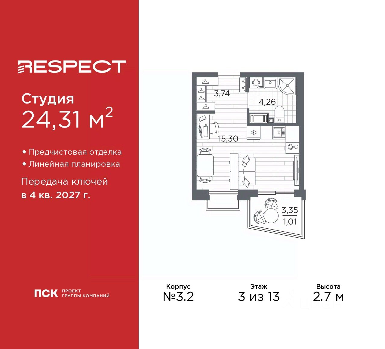 Однокомнатная квартира-студия с предчистовой отделкой в ЖК ''RESPECT'' на 3 этаже. Общая площадь: 24.31 кв.м., площадь гостиной 15.3 кв.м., из которых 5 кв.м. выделено под кухонную зону. Все окна выходят на одну сторону. В квартире один балкон, один совмещенный санузел. Высота потолков 2.7 м. Дом монолитный, многоподъездный, переменной этажности, от 10 до 13 этажей. Квартира находится в 1-й секции высотой 13 этажей в корпусе 3.2. На этаже 5 квартир. В подъезде 1 пассажирский и 1 грузовой лифт. Начало строительства - 3 квартал 2025 года. Окончание строительства - 4 квартал 2027 года. Оформление сделки по договору долевого участия. В шаговой доступности от жилого комплекса расположены станции метро (расстояние по прямой): ''Лесная'' (800 м), ''Площадь Мужества'' (1.4 км), ''Выборгская'' (1.9 км), также недалеко от этого корпуса находятся станции метро: ''Академическая'', ''Политехническая''. Жилой квартал ''RESPECT'' строится на Полюстровском пр, 87, в одной из самых востребованных локаций Петербурга. В 10 минутах пешком - метро ''Лесная'' и в 10 минутах на транспорте - Петроградская сторона. Высота домов от 7 до 13 этажей. Квартиры сдаются с отделкой white box и с чистовой отделкой. На территории Respect строится школа на 1125 учащихся и детский сад на 240 мест. Запроектированы собственная газовая котельная, закрытая территория, дворы без машин и подземные паркинги с лифтами. В проекте предусмотрены трапециевидные балконы или остекленные лоджии, которые, с одной стороны, исключают монотонность фасада, являясь декоративными элементами, с другой дополнительным функциональным пространством в квартирах. Цветовая гармония фасадов каждого дома раскрывает характер квартала. Коричневый цвет клинкерного кирпича со структурой водяных штрихов — цвет уюта и безопасности, сдержанности и надёжности. Вентилируемые фасады облицованы клинкерным кирпичом. Его высокая прочность позволяет давать 100 лет гарантии на этот материал. Водопоглощение клинкерного кирпича составляет менее 5%, за счет чего у него высокая теплопроводность и прочность. В квартале запроектированы внутренние закрытые территории дворов домов без доступа автомобилей и безбарьерная среда для велосипедистов и колясок. Предусмотрены IP-домофония с функцией дистанционного открывания калиток и парадных, а также дистанционный сбор показаний счетчиков и мобильное приложение для жителей. Для безопасности жителей квартала - круглосуточное видеонаблюдение и служба охраны. В каждой квартире предусмотрены внешние корзины для кондиционеров. Вся территория квартала будет связана единой концепцией благоустройства, разработанной ландшафтным бюро L.BURO. На эксплуатируемой кровле на уровне первого этажа в домах 1 и 4 будут обустроены общественные видовые террасы. Это станет не только привлекательным местом с красивым видом, но и удобным, многофункциональным пространством. Дизайн парадных зон и входных групп - сочетание лаконичности отделки и декоративных элементов с текстурами из натурального камня и дерева