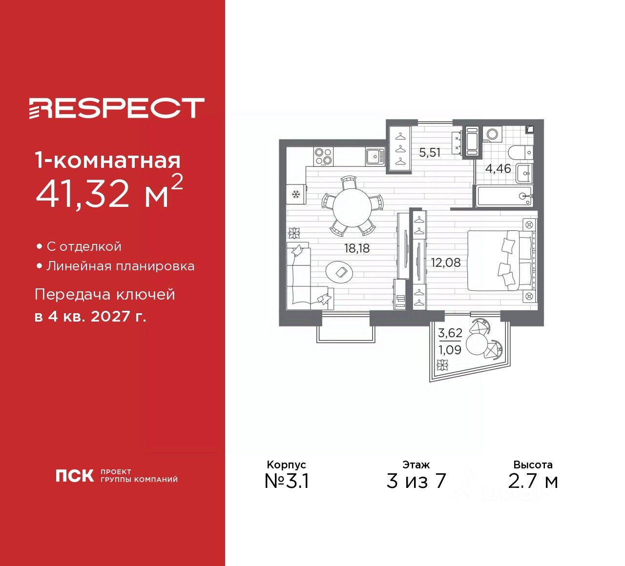 Просторная 1-комн. квартира с отделкой в ЖК ''RESPECT'' на 3 этаже. Общая площадь: 41.32 кв.м., жилая: 12.08 кв.м., площадь просторной кухни-столовой: 18.18 кв.м. Все окна выходят на одну сторону. В квартире один балкон, один совмещенный санузел. Высота потолков 2.7 м. Квартира находится в корпусе 3.1. Дом монолитный, одноподъездный, высотой 7 этажей. На этаже 4 квартиры. В подъезде 1 пассажирский и 1 грузовой лифт. Начало строительства - 3 квартал 2025 года. Окончание строительства - 4 квартал 2027 года. Оформление сделки по договору долевого участия. В шаговой доступности от жилого комплекса расположены станции метро (расстояние по прямой): ''Лесная'' (800 м), ''Площадь Мужества'' (1.4 км), ''Выборгская'' (1.9 км), также недалеко от этого корпуса расположены станции метро: ''Академическая'', ''Политехническая''. Квартал строится на Полюстровском пр, 87, в одной из самых востребованных локаций Петербурга. В 10 минутах пешком - метро ''Лесная'' и в 10 минутах на транспорте - Петроградская сторона. Высота домов от 7 до 13 этажей. На территории Respect строится школа на 1125 учащихся и детский сад на 240 мест. Запроектированы собственная газовая котельная, закрытая территория, дворы без машин и подземные паркинги с лифтами. Вентилируемые фасады облицованы клинкерным кирпичом. Дома из этого материала служат веками, являясь гордостью хозяев. Дизайн парадных зон и входных групп - сочетание лаконичности отделки и декоративных элементов с текстурами из натурального камня и дерева с приглушенной подсветкой теплым светом. Во входных группах расположены гостевые зоны с мягкой мебелью. Вся территория квартала будет связана единой концепцией благоустройства, разработанной ландшафтным бюро L.BURO. В основе - идея создания увлекательного ландшафтного пространства для насыщенной жизни, включающего в себя пейзажные зоны, современные архитектурные композиции, открытые террасы на стилобатах с зонами отдыха и парклетами, спортивными площадками. Это пространство для людей всех возрастов и различных увлечений. На эксплуатируемой кровле на уровне первого этажа в домах 1 и 4 будут обустроены общественные видовые террасы. В квартале запроектированы внутренние закрытые территории дворов домов без доступа автомобилей и безбарьерная среда для велосипедистов и колясок. Предусмотрены IP-домофония с функцией дистанционного открывания калиток и парадных, а также дистанционный сбор показаний счетчиков и мобильное приложение для жителей. Для безопасности жителей квартала - круглосуточное видеонаблюдение и служба охраны. В каждой квартире предусмотрены внешние корзины для кондиционеров. #2MBbIz