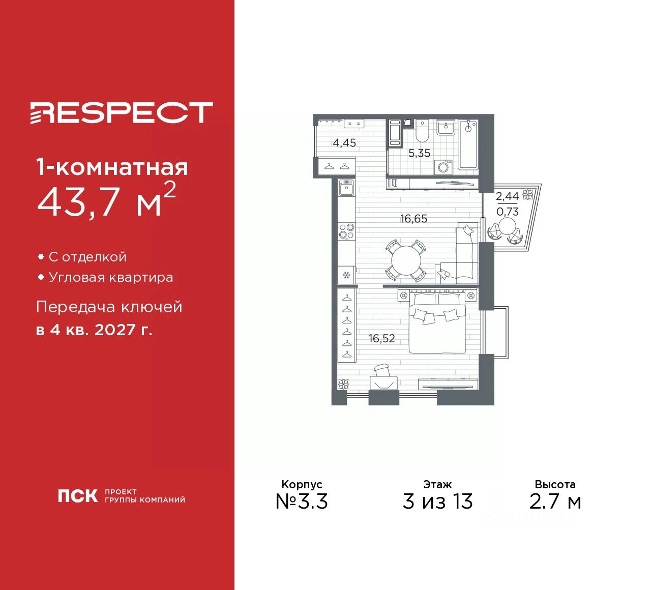 1-комн. квартира от застройщика с отделкой в ЖК ''RESPECT'' на 3 этаже. Общая площадь: 43.7 кв.м., жилая: 16.52 кв.м., площадь просторной кухни-столовой: 16.65 кв.м. Угловая квартира, очень светлая, естественная вентиляция при открытии окон. В квартире один балкон, один совмещенный санузел. Высота потолков 2.7 м. Дом монолитный, многоподъездный, переменной этажности, от 8 до 13 этажей. Квартира находится в 1-й секции высотой 13 этажей в корпусе 3.3. На этаже 6 квартир. В подъезде 1 пассажирский и 1 грузовой лифт. Начало строительства - 3 квартал 2025 года. Окончание строительства - 4 квартал 2027 года. Оформление сделки по договору долевого участия. В шаговой доступности от жилого комплекса находятся станции метро (расстояние по прямой): ''Лесная'' (800 м), ''Площадь Мужества'' (1.4 км), ''Выборгская'' (1.9 км), также недалеко от этого корпуса находятся станции метро: ''Академическая'', ''Политехническая''. Жилой квартал ''RESPECT'' строится на Полюстровском пр, 87, в одной из самых востребованных локаций Петербурга. В 10 минутах пешком - метро ''Лесная'' и в 10 минутах на транспорте - Петроградская сторона. Высота домов от 7 до 13 этажей. Квартиры сдаются с отделкой white box и с чистовой отделкой. На территории Respect строится школа на 1125 учащихся и детский сад на 240 мест. Запроектированы собственная газовая котельная, закрытая территория, дворы без машин и подземные паркинги с лифтами. В проекте предусмотрены трапециевидные балконы или остекленные лоджии, которые, с одной стороны, исключают монотонность фасада, являясь декоративными элементами, с другой дополнительным функциональным пространством в квартирах. Цветовая гармония фасадов каждого дома раскрывает характер квартала. Коричневый цвет клинкерного кирпича со структурой водяных штрихов — цвет уюта и безопасности, сдержанности и надёжности. Вентилируемые фасады облицованы клинкерным кирпичом. Его высокая прочность позволяет давать 100 лет гарантии на этот материал. Водопоглощение клинкерного кирпича составляет менее 5%, за счет чего у него высокая теплопроводность и прочность. В квартале запроектированы внутренние закрытые территории дворов домов без доступа автомобилей и безбарьерная среда для велосипедистов и колясок. Предусмотрены IP-домофония с функцией дистанционного открывания калиток и парадных, а также дистанционный сбор показаний счетчиков и мобильное приложение для жителей. Для безопасности жителей квартала - круглосуточное видеонаблюдение и служба охраны. В каждой квартире предусмотрены внешние корзины для кондиционеров. Вся территория квартала будет связана единой концепцией благоустройства, разработанной ландшафтным бюро L.BURO. На эксплуатируемой кровле на уровне первого этажа в домах 1 и 4 будут обустроены общественные видовые террасы. Это станет не только привлекательным местом с красивым видом, но и удобным, многофункциональным пространством. Дизайн парадных зон и входных групп - сочетание лаконичности отделки и декоративных элементов с текстурами из натуральн