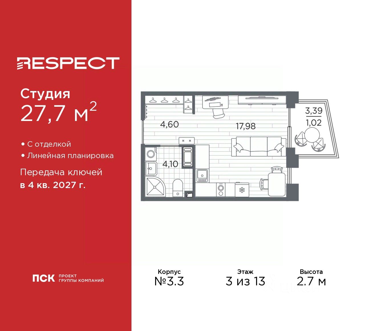 1-комн. квартира-студия от застройщика с отделкой в ЖК ''RESPECT'' на 3 этаже. Общая площадь: 27.7 кв.м., площадь гостиной 17.98 кв.м., из которых 5 кв.м. выделено под кухонную зону. Все окна выходят на одну сторону. В квартире один балкон, один совмещенный санузел. Высота потолков 2.7 м. Дом монолитный, многоподъездный, переменной этажности, от 8 до 13 этажей. Квартира находится в 1-й секции высотой 13 этажей в корпусе 3.3. На этаже 6 квартир. В подъезде 1 пассажирский и 1 грузовой лифт. Начало строительства - 3 квартал 2025 года. Окончание строительства - 4 квартал 2027 года. Оформление сделки по договору долевого участия. В шаговой доступности от жилого комплекса находятся станции метро (расстояние по прямой): ''Лесная'' (800 м), ''Площадь Мужества'' (1.4 км), ''Выборгская'' (1.9 км), также недалеко от этого корпуса расположены станции метро: ''Академическая'', ''Политехническая''. Жилой квартал ''RESPECT'' строится на Полюстровском пр, 87, в одной из самых востребованных локаций Петербурга. В 10 минутах пешком - метро ''Лесная'' и в 10 минутах на транспорте - Петроградская сторона. Высота домов от 7 до 13 этажей. Квартиры сдаются с отделкой white box и с чистовой отделкой. На территории Respect строится школа на 1125 учащихся и детский сад на 240 мест. Запроектированы собственная газовая котельная, закрытая территория, дворы без машин и подземные паркинги с лифтами. В проекте предусмотрены трапециевидные балконы или остекленные лоджии, которые, с одной стороны, исключают монотонность фасада, являясь декоративными элементами, с другой дополнительным функциональным пространством в квартирах. Цветовая гармония фасадов каждого дома раскрывает характер квартала. Коричневый цвет клинкерного кирпича со структурой водяных штрихов — цвет уюта и безопасности, сдержанности и надёжности. Вентилируемые фасады облицованы клинкерным кирпичом. Его высокая прочность позволяет давать 100 лет гарантии на этот материал. Водопоглощение клинкерного кирпича составляет менее 5%, за счет чего у него высокая теплопроводность и прочность. В квартале запроектированы внутренние закрытые территории дворов домов без доступа автомобилей и безбарьерная среда для велосипедистов и колясок. Предусмотрены IP-домофония с функцией дистанционного открывания калиток и парадных, а также дистанционный сбор показаний счетчиков и мобильное приложение для жителей. Для безопасности жителей квартала - круглосуточное видеонаблюдение и служба охраны. В каждой квартире предусмотрены внешние корзины для кондиционеров. Вся территория квартала будет связана единой концепцией благоустройства, разработанной ландшафтным бюро L.BURO. На эксплуатируемой кровле на уровне первого этажа в домах 1 и 4 будут обустроены общественные видовые террасы. Это станет не только привлекательным местом с красивым видом, но и удобным, многофункциональным пространством. Дизайн парадных зон и входных групп - сочетание лаконичности отделки и декоративных элементов с текстурами из натурального камня и дерева с пр