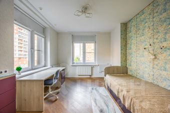Предлагается к продаже квартира площадью 152,8 кв. м с новым ремонтом высокого уровня в современном жилом комплексе.Фасады дома облицованы архитектурной плиткой Hunter Douglas (Португалия) с интегрированной подсветкой Martini Light, остекление выполнено из профильных систем Reynaers и Alutech, установлены окна Gealan Kubus. В комплексе предусмотрена система фильтрации воды, IP-домофония Urmet, система сбора мусора ECO.LIFT. Лифты KONE MonoSpace обслуживают доступ до уровня подземного паркинга, оборудованного зарядными станциями для электромобилей.Функциональная планировка включает кухню-гостиную-столовую, спальню, две детские комнаты, ванную, гостевой санузел, холл и прихожую. Особенностью квартиры являются три галереи: в гостиной организован спортивный зал с сауной и душевой, в спальне расположена гардеробная, в детской — спальня и зона отдыха.В отделке использованы натуральные материалы: паркетная доска Kahrs (Швеция) из брашированного дуба, цельный итальянский керамогранит. Мебель представлена брендами Koinor (Германия) и Cattelan Italia. Бытовая техника — Miele (полностью сенсорная линейка), холодильники и винный шкаф Liebherr. Спортивное оборудование включает Technogym (Италия), Yamaguchi (Япония), сауну Sawo (Финляндия).Сантехника — Nicolazzi (Италия), Hansgrohe (Германия). В интерьере использованы элементы декора: биокамин, авторские картины Лилии Коган, система освещения ''умный дом'' с люстрой Sagarti (4,2 м) и светильниками немецких и итальянских брендов.Квартира оснащена приточно-вытяжной вентиляцией, кондиционированием Fujitsu (Япония), системой тёплых полов в санузлах и прихожей. В подземном паркинге предусмотрены два машиноместа.