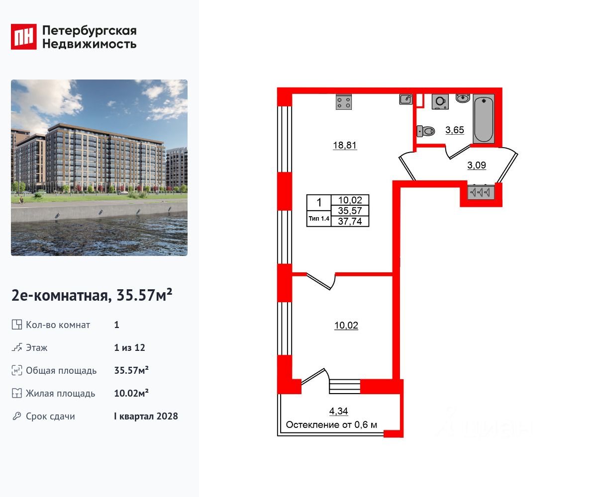 Продается просторная 1-комнатная квартира от застройщика в жилом комплексе ''Setl Ривьера'' в активно развивающимся Невском районе. До метро можно добраться на транспорте всего за 10 минут. Удобная, классическая, функциональная европланировка, большая кухня-гостиная 18.81 м², вместительная прихожая 3.09 м². Общая площадь квартиры - 35.57 м², жилая 10.02 м², высота потолка 2.92 м. Квартира продается с отделкой ''NORD LINE WHITE ВК NEW''. Что особенного в ЖК ''Setl Ривьера''? • Первая береговая линия Невы. 5 км до центра Петербурга • ''Активити парк'' - пространство для занятий спортом и отдыха. ''Ривьера парк'' с променадом и панорамной ротондой • Масштабные дворы 10 000 кв.м. с авторским ландшафтным дизайном • Двухуровневые единые входные группы • Видовые квартиры с террасами, каминами и саунами