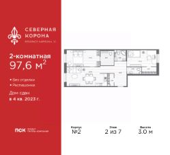 Двухкомнатная квартира в ЖК ''Северная корона'' на 2 этаже. Квартира без отделки, после оформления собственности можно делать ремонт. Общая площадь: 97.6 кв.м., жилая: 36.53 кв.м., площадь просторной кухни-столовой: 25.7 кв.м. Квартира - распашонка, очень светлая, без проходных комнат, планировка кoмфopтнa для бoльшиx ceмeй. В квартире два совмещенных и один раздельный санузел. Высота потолков 3.0 м. Дом монолитный, двухподъездный, высотой 7 этажей. Квартира находится в 1-й секции в корпусе 2. На этаже 4 квартиры. В подъезде 1 грузовой лифт. В настоящее время строительство окончено, дом сдан в 4 квартале 2023 года. Оформление сделки по договору купли-продажи. В шаговой доступности от жилого комплекса находятся станции метро (расстояние по прямой): ''Петроградская'' (500 м), ''Чкаловская'' (1.3 км), ''Горьковская'' (1.7 км), ''Чёрная речка'' (1.7 км), также недалеко от этого корпуса расположены станции метро: ''Чернышевская'', ''Спортивная''. Премиальный жилой комплекс ''Северная корона'' расположился в парадной части Петроградской стороны на пересечении ее главного проспекта — Каменноостровского и набережной реки Карповки.Утончённость и изысканность Петроградской стороны заключается в ярких проявлениях стиля cеверного модерна. Архитектура премиального дома ''Северная корона'' — это современное воплощение и новое развитие архитектуры северного модерна. Особенность и уникальность дома в его протяженности вдоль реки Карповки. Фасад исключает монотонность, линии интегрированы в канву курдонера и внутренних общественных пространств, обращённых как в сторону Каменноостровского проспекта, так и Иоановского монастыря. Все квартиры в полной мере можно назвать видовыми они открыты историческому окружению и ландшафтной архитектуре. Что дарит владельцам единственные в своем роде захватывающие виды.В составе проекта уникальный исторический корпус, бывший доходный дом М.К. Покотиловой. Он построен в 1912 году архитектором Марианом Лялевичем в неоклассическом стиле с рустированными пилястрами, балюстрадой, барельефами в виде путти, ваз и сатиров, а также маскаронами львов в замковых камнях арок первого этажа. Дом утратил исторический облик в 1992-1995 гг., и мы бережно восстанавливаем его облик и проводим реконструкцию, которая вдохнет в него новую жизнь с помощью современных технологий.Этажность: 4 - 9 этажей.Дом СДАН. Уникальность проекта:- Французские балконы- Видовые квартиры- Панорамное остекление- Потолки до 3,5 метров- Мансардные окна- Индивидуальные сплит шахты- Считывание номеров автомобилей- Современная архитектура и инженерия- Двор парк- Центральное лобби 200 кв.м. #ZUAwOc