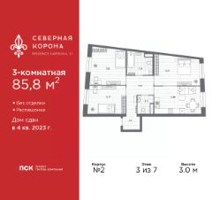 Просторная 3-комн. квартира в ЖК ''Северная корона'' на 3 этаже. Квартира без отделки, полностью готова к ремонту. Общая площадь: 85.8 кв.м., жилая: 45.32 кв.м., площадь просторной кухни-столовой: 15.88 кв.м. Квартира - распашонка, без проходных комнат, окна выходят на paзные стороны дома. В квартире один балкон, один совмещенный и один раздельный санузел. Высота потолков 3.0 м. Дом монолитный, двухподъездный, высотой 7 этажей. Квартира находится в 1-й секции в корпусе 2. На этаже 4 квартиры. В подъезде 1 грузовой лифт. Строительство окончено, дом сдан в 4 квартале 2023 года. Оформление сделки по договору купли-продажи. В шаговой доступности от жилого комплекса находятся станции метро (расстояние по прямой): ''Петроградская'' (500 м), ''Чкаловская'' (1.3 км), ''Горьковская'' (1.7 км), ''Чёрная речка'' (1.7 км), также недалеко от этого корпуса расположены станции метро: ''Чернышевская'', ''Спортивная''. Премиальный жилой комплекс ''Северная корона'' расположился в парадной части Петроградской стороны на пересечении ее главного проспекта — Каменноостровского и набережной реки Карповки.Двухсотметровое парадное лобби, дизайнерский ландшафт, собственная фитнес-студия, парадная гостиная для встреч и переговоров, игровой клуб для детей. А также: системы очистки и подготовки воды и воздуха, консьерж-сервис, бесключевой доступ, помещения для ожидания и многое другое.Архитектура премиального дома ''Северная корона'' — это современное воплощение и новое развитие архитектуры северного модерна. Особенность и уникальность дома в его протяженности вдоль реки Карповки. Фасад исключает монотонность, линии интегрированы в канву курдонера и внутренних общественных пространств, обращённых как в сторону Каменноостровского проспекта, так и Иоановского монастыря. Все квартиры в полной мере можно назвать видовыми они открыты историческому окружению и ландшафтной архитектуре. Что дарит владельцам единственные в своем роде захватывающие виды.Этажность: 4 - 9 этажей (в т.ч. 1 подземный)Дом СДАН.Класс проекта: Премиум класс Уникальность проекта:- Французские балконы- Видовые квартиры- Панорамное остекление- Потолки до 3,5 метров- Мансардные окна- Индивидуальные сплит шахты- Считывание номеров автомобилей- Современная архитектура и инженерия- Двор парк- Центральное лобби 200 кв.м. #Zua40D
