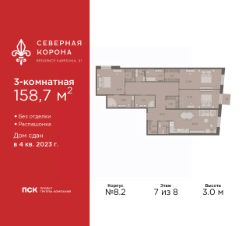 Продается 3-комн. квартира в ЖК ''Северная корона'' на 7 этаже. Квартира без отделки, новый собственник может сделать ремонт по своему дизайн-проекту. Общая площадь: 158.7 кв.м., жилая: 59.51 кв.м., площадь просторной кухни-столовой: 28.33 кв.м. Квартира - распашонка, без проходных комнат, окна выходят на paзные стороны дома. В квартире один балкон, три совмещенных и один раздельный санузел. Высота потолков 3.0 м. Дом монолитный, черырехподъездный, высотой 8 этажей. Квартира находится в 1-й секции в корпусе 8.2. На этаже 3 квартиры. В подъезде 1 грузовой лифт. Строительство окончено, дом сдан в 4 квартале 2023 года. Оформление сделки по договору купли-продажи. В шаговой доступности от жилого комплекса расположены станции метро (расстояние по прямой): ''Петроградская'' (500 м), ''Чкаловская'' (1.3 км), ''Горьковская'' (1.7 км), ''Чёрная речка'' (1.7 км), также недалеко от этого корпуса находятся станции метро: ''Чернышевская'', ''Спортивная''. Премиальный жилой комплекс ''Северная корона'' расположился в парадной части Петроградской стороны на пересечении ее главного проспекта — Каменноостровского и набережной реки Карповки.Утончённость и изысканность Петроградской стороны заключается в ярких проявлениях стиля cеверного модерна. Архитектура премиального дома ''Северная корона'' — это современное воплощение и новое развитие архитектуры северного модерна. Особенность и уникальность дома в его протяженности вдоль реки Карповки. Фасад исключает монотонность, линии интегрированы в канву курдонера и внутренних общественных пространств, обращённых как в сторону Каменноостровского проспекта, так и Иоановского монастыря. Все квартиры в полной мере можно назвать видовыми они открыты историческому окружению и ландшафтной архитектуре. Что дарит владельцам единственные в своем роде захватывающие виды.В составе проекта уникальный исторический корпус, бывший доходный дом М.К. Покотиловой. Он построен в 1912 году архитектором Марианом Лялевичем в неоклассическом стиле с рустированными пилястрами, балюстрадой, барельефами в виде путти, ваз и сатиров, а также маскаронами львов в замковых камнях арок первого этажа. Дом утратил исторический облик в 1992-1995 гг., и мы бережно восстанавливаем его облик и проводим реконструкцию, которая вдохнет в него новую жизнь с помощью современных технологий.Этажность: 4 - 9 этажей.Дом СДАН. Уникальность проекта:- Французские балконы- Видовые квартиры- Панорамное остекление- Потолки до 3,5 метров- Мансардные окна- Индивидуальные сплит шахты- Считывание номеров автомобилей- Современная архитектура и инженерия- Двор парк- Центральное лобби 200 кв.м. #zSsuc1
