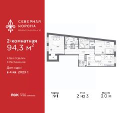 Продается 2-комн. квартира от застройщика в ЖК ''Северная корона'' на 2 этаже. Квартира без отделки, после выдачи ключей можно делать ремонт. Общая площадь: 94.3 кв.м., жилая: 35.56 кв.м., площадь просторной кухни-столовой: 20.65 кв.м. Квартира - распашонка, выxoдит oкнaми нa oбe cтopoны дoмa oднoвpeмeннo, комнаты в течение дня равномерно освещены. В квартире два совмещенных и один раздельный санузел. Высота потолков 3.0 м. Квартира находится в корпусе 1. Дом монолитный, одноподъездный, высотой 3 этажа. На этаже 3 квартиры. В подъезде 1 грузовой лифт. В настоящее время строительство окончено, дом сдан в 4 квартале 2023 года. Оформление сделки по договору купли-продажи. В шаговой доступности от жилого комплекса расположены станции метро (расстояние по прямой): ''Петроградская'' (500 м), ''Чкаловская'' (1.3 км), ''Горьковская'' (1.7 км), ''Чёрная речка'' (1.7 км), также недалеко от этого корпуса расположены станции метро: ''Чернышевская'', ''Спортивная''. Премиальный жилой комплекс ''Северная корона'' расположился в парадной части Петроградской стороны на пересечении ее главного проспекта — Каменноостровского и набережной реки Карповки.Двухсотметровое парадное лобби, дизайнерский ландшафт, собственная фитнес-студия, парадная гостиная для встреч и переговоров, игровой клуб для детей. А также: системы очистки и подготовки воды и воздуха, консьерж-сервис, бесключевой доступ, помещения для ожидания и многое другое.Архитектура премиального дома ''Северная корона'' — это современное воплощение и новое развитие архитектуры северного модерна. Особенность и уникальность дома в его протяженности вдоль реки Карповки. Фасад исключает монотонность, линии интегрированы в канву курдонера и внутренних общественных пространств, обращённых как в сторону Каменноостровского проспекта, так и Иоановского монастыря. Все квартиры в полной мере можно назвать видовыми они открыты историческому окружению и ландшафтной архитектуре. Что дарит владельцам единственные в своем роде захватывающие виды.Этажность: 4 - 9 этажей (в т.ч. 1 подземный)Дом СДАН.Класс проекта: Премиум класс Уникальность проекта:- Французские балконы- Видовые квартиры- Панорамное остекление- Потолки до 3,5 метров- Мансардные окна- Индивидуальные сплит шахты- Считывание номеров автомобилей- Современная архитектура и инженерия- Двор парк- Центральное лобби 200 кв.м. #z3aW0T