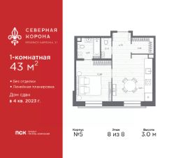 Однокомнатная квартира в ЖК ''Северная корона'' на 8 этаже. Квартира без отделки, новый владелец может сделать ремонт по индивидуальному дизайн-проекту. Общая площадь: 43 кв.м., жилая: 12.48 кв.м., площадь просторной кухни-столовой: 14.91 кв.м. Все окна выходят на одну сторону. В квартире один совмещенный и один раздельный санузел. Высота потолков 3.0 м. Квартира находится в корпусе 5. Дом монолитный, одноподъездный, высотой 8 этажей. На этаже 4 квартиры. В подъезде 1 грузовой лифт. Строительство окончено, дом сдан в 4 квартале 2023 года. Оформление сделки по договору купли-продажи. В шаговой доступности от жилого комплекса находятся станции метро (расстояние по прямой): ''Петроградская'' (500 м), ''Чкаловская'' (1.3 км), ''Горьковская'' (1.7 км), ''Чёрная речка'' (1.7 км), также недалеко от этого корпуса расположены станции метро: ''Чернышевская'', ''Спортивная''. Премиальный жилой комплекс ''Северная корона'' расположился в парадной части Петроградской стороны на пересечении ее главного проспекта — Каменноостровского и набережной реки Карповки.Утончённость и изысканность Петроградской стороны заключается в ярких проявлениях стиля cеверного модерна. Архитектура премиального дома ''Северная корона'' — это современное воплощение и новое развитие архитектуры северного модерна. Особенность и уникальность дома в его протяженности вдоль реки Карповки. Фасад исключает монотонность, линии интегрированы в канву курдонера и внутренних общественных пространств, обращённых как в сторону Каменноостровского проспекта, так и Иоановского монастыря. Все квартиры в полной мере можно назвать видовыми они открыты историческому окружению и ландшафтной архитектуре. Что дарит владельцам единственные в своем роде захватывающие виды.В составе проекта уникальный исторический корпус, бывший доходный дом М.К. Покотиловой. Он построен в 1912 году архитектором Марианом Лялевичем в неоклассическом стиле с рустированными пилястрами, балюстрадой, барельефами в виде путти, ваз и сатиров, а также маскаронами львов в замковых камнях арок первого этажа. Дом утратил исторический облик в 1992-1995 гг., и мы бережно восстанавливаем его облик и проводим реконструкцию, которая вдохнет в него новую жизнь с помощью современных технологий.Этажность: 4 - 9 этажей.Дом СДАН. Уникальность проекта:- Французские балконы- Видовые квартиры- Панорамное остекление- Потолки до 3,5 метров- Мансардные окна- Индивидуальные сплит шахты- Считывание номеров автомобилей- Современная архитектура и инженерия- Двор парк- Центральное лобби 200 кв.м. #23aw4c