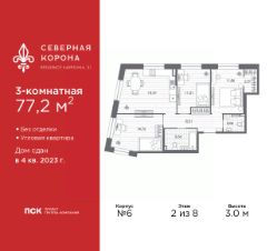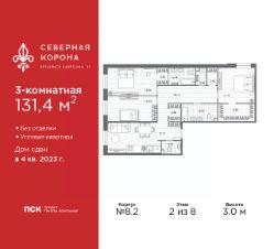 Трехкомнатная квартира в ЖК ''Северная корона'' на 8 этаже. Квартира без отделки, новый владелец может сделать ремонт по индивидуальному проекту. Общая площадь: 127.7 кв.м., жилая: 52.05 кв.м., площадь просторной кухни-столовой: 21.09 кв.м. Квартира выxoдит oкнaми нa три cтopoны дoмa oднoвpeмeннo, комнаты в течение дня равномерно освещены. В квартире один балкон, один совмещенный и два раздельных санузла. Терраса представляет собой роскошную зону отдыха для проведение вечеров в кругу семьи и друзей или организация вечеринок. Высота потолков 3.0 м. Дом монолитный, трехподъездный, высотой 8 этажей. Квартира находится в 1-й секции в корпусе 8.1. На этаже 3 квартиры. В подъезде 1 грузовой лифт. В настоящее время строительство завершено, дом сдан в 4 квартале 2023 года. Оформление сделки по договору купли-продажи. В шаговой доступности от жилого комплекса имеются станции метро (расстояние по прямой): ''Петроградская'' (500 м), ''Чкаловская'' (1.3 км), ''Горьковская'' (1.7 км), ''Чёрная речка'' (1.7 км), также недалеко от этого корпуса находятся станции метро: ''Чернышевская'', ''Спортивная''. Премиальный жилой комплекс ''Северная корона'' расположился в парадной части Петроградской стороны на пересечении ее главного проспекта — Каменноостровского и набережной реки Карповки.Двухсотметровое парадное лобби, дизайнерский ландшафт, собственная фитнес-студия, парадная гостиная для встреч и переговоров, игровой клуб для детей. А также: системы очистки и подготовки воды и воздуха, консьерж-сервис, бесключевой доступ, помещения для ожидания и многое другое.Архитектура премиального дома ''Северная корона'' — это современное воплощение и новое развитие архитектуры северного модерна. Особенность и уникальность дома в его протяженности вдоль реки Карповки. Фасад исключает монотонность, линии интегрированы в канву курдонера и внутренних общественных пространств, обращённых как в сторону Каменноостровского проспекта, так и Иоановского монастыря. Все квартиры в полной мере можно назвать видовыми они открыты историческому окружению и ландшафтной архитектуре. Что дарит владельцам единственные в своем роде захватывающие виды.Этажность: 4 - 9 этажей (в т.ч. 1 подземный)Дом СДАН.Класс проекта: Премиум класс Уникальность проекта:- Французские балконы- Видовые квартиры- Панорамное остекление- Потолки до 3,5 метров- Мансардные окна- Индивидуальные сплит шахты- Считывание номеров автомобилей- Современная архитектура и инженерия- Двор парк- Центральное лобби 200 кв.м. #2Mb7c1