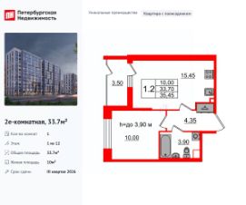 Продается уютная 1-комнатная квартира от застройщика в жилом комплексе ''Бионика Заповедная'' в динамичном Приморском районе.До метро можно добраться на транспорте всего за 11 минут.Уникальная, функциональная европланировка, большая кухня-гостиная 15.45 м², просторная прихожая 4.35 м². Общая площадь квартиры - 33.7 м², жилая 10 м², высота потолка 3.97 м.Квартира продается с отделкой ''NORD LINE WHITE ВК NEW''.Что особенного в ЖК ''Бионика Заповедная''?• Оазис в городе 3 минуты пешком до Новоорловского заказника (140 ГА)• Захватывающие виды из окон на хвойный лесопарк• Всесезонный ''Заповедный парк'' во дворе площадью 23000 кв.м.• 5 единых входных групп с авторским дизайном и лаундж-зонами, сити-виллы на первых этажах с палисадниками и высотой потолков до 4 м• Места притяжения: фонтан ''Бионика'', спортивный кластер со скейт-парком, фотозоны с арт-объектами