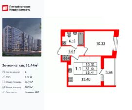 Продается уютная 1-комнатная квартира от застройщика в жилом комплексе ''Бионика Заповедная'' в динамичном Приморском районе.До метро можно добраться на транспорте всего за 11 минут.Удобная, классическая, функциональная европланировка, большая кухня-гостиная 13.4 м², вместительная прихожая 3.61 м². Общая площадь квартиры - 31.44 м², жилая 10.33 м², высота потолка 2.77 м.Квартира продается с отделкой ''NORD LINE WHITE ВК NEW''.Что особенного в ЖК ''Бионика Заповедная''?• Оазис в городе 3 минуты пешком до Новоорловского заказника (140 ГА)• Захватывающие виды из окон на хвойный лесопарк• Всесезонный ''Заповедный парк'' во дворе площадью 23000 кв.м.• 5 единых входных групп с авторским дизайном и лаундж-зонами, сити-виллы на первых этажах с палисадниками и высотой потолков до 4 м• Места притяжения: фонтан ''Бионика'', спортивный кластер со скейт-парком, фотозоны с арт-объектами