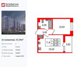 Продается уютная 1-комнатная квартира от застройщика в жилом комплексе ''Бионика Заповедная'' в динамичном Приморском районе.До метро можно добраться на транспорте всего за 11 минут.Удобная, классическая, функциональная европланировка, большая кухня-гостиная 15.23 м², вместительная прихожая 3.45 м². Общая площадь квартиры - 33.29 м², жилая 10.03 м², высота потолка 2.77 м.Квартира продается с отделкой ''NORD LINE WHITE ВК NEW''.Что особенного в ЖК ''Бионика Заповедная''?• Оазис в городе 3 минуты пешком до Новоорловского заказника (140 ГА)• Захватывающие виды из окон на хвойный лесопарк• Всесезонный ''Заповедный парк'' во дворе площадью 23000 кв.м.• 5 единых входных групп с авторским дизайном и лаундж-зонами, сити-виллы на первых этажах с палисадниками и высотой потолков до 4 м• Места притяжения: фонтан ''Бионика'', спортивный кластер со скейт-парком, фотозоны с арт-объектами