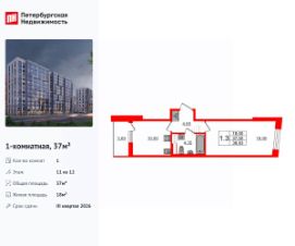 Продается просторная 1-комнатная квартира от застройщика в жилом комплексе ''Бионика Заповедная'' в динамичном Приморском районе.До метро можно добраться на транспорте всего за 11 минут.Удобная, классическая планировка, кухня 10 м², просторная прихожая 4.65 м². Общая площадь квартиры - 37 м², жилая 18 м², высота потолка 2.77 м.Квартира продается с отделкой ''NORD LINE SILVER ВК NEW''.Что особенного в ЖК ''Бионика Заповедная''?• Оазис в городе 3 минуты пешком до Новоорловского заказника (140 ГА)• Захватывающие виды из окон на хвойный лесопарк• Всесезонный ''Заповедный парк'' во дворе площадью 23000 кв.м.• 5 единых входных групп с авторским дизайном и лаундж-зонами, сити-виллы на первых этажах с палисадниками и высотой потолков до 4 м• Места притяжения: фонтан ''Бионика'', спортивный кластер со скейт-парком, фотозоны с арт-объектами