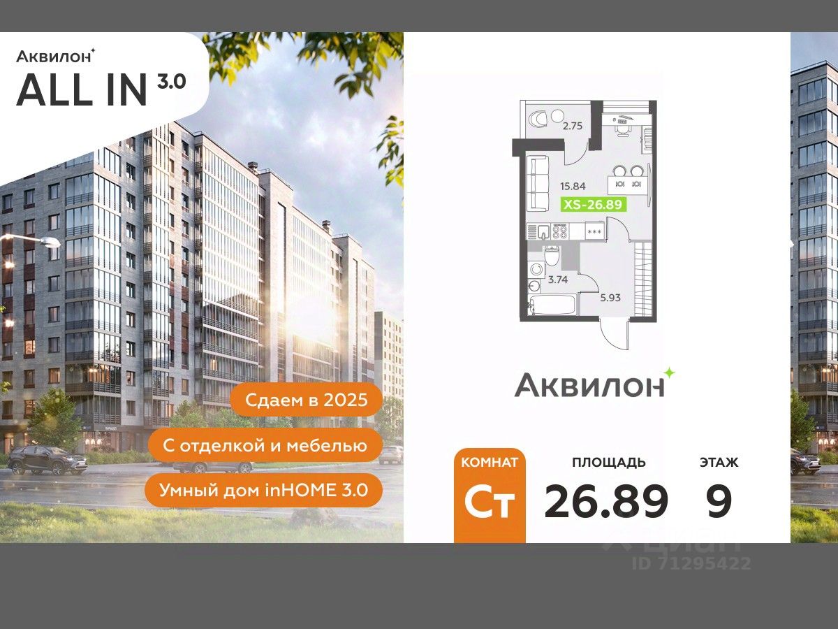 Купи квартиру в ''ЖК All in 3.0'' Отделка В квартире выполнена предчистовая отделка WhiteBox +Возможен дозаказ отделки в любом из 3 цветов: SAND, TERRA, GRAPHITE Отделка входит в стоимость квартиры в ДДУ ЖК Аквилон All in 3.0 в Пушкинском районе Петербурга. Это 12-этажный дом на Школьной улице на 812 квартир с отапливаемым подземным паркингом. -Малошумные лифты -Сквозные парадные -Светопрозрачные входные группы -Увеличенная высота первого этажа -Безбарьерная среда -Подземный паркинг Как и все другие проекты, ЖК Аквилон All in 3.0 мы реализуем на базе концепции Э4. Она подразумевает внедрение технологических разработок по 4 направлениям: энергоэффективности, эргономики, экологичности, экономии средств и времени жителей. Стандарты Группы Аквилон для вашей комфортной жизни Thermo-S экономия на коммунальных платежах за счет дополнительно утепленных стен, кровли и цоколя. Энергоэффективные окна с селективным покрытием и аргоновым заполнением Soundstop - дополнительная шумоизоляция внутренних перегородок и межэтажных перекрытий, шумозащитные окна, малошумные лифты Light-in - в квартирах устанавливаются широкоформатные окна, увеличены на 30%. Высота подоконников на уровне 60 см от пола. Vent-in - в каждой комнате есть клапаны индивидуальной вентиляции, которые обеспечивают приток свежего воздуха с улицы. inHOME 3.0 умный дом в каждой квартире Интеллектуальная цифровая система, которая позволит дистанционно решать бытовые вопросы, управлять квартирой и экономить на оплате коммунальных услуг. В состав inHOME входят: IP-домофон, Face key, ''умные'' счетчики, датчики протечки, дистанционное отключение розеток, и т.д. Жилой комплекс расположится в уже развитом районе с хорошей транспортной и социальной инфраструктурой: рядом — выезд на КАД, 15 минут до метро ''Купчино'' и аэропорта Пулково. #ZsaeZd