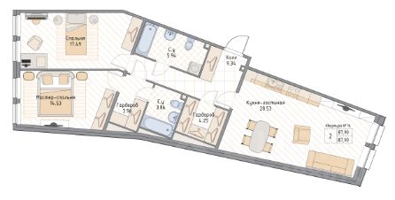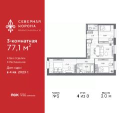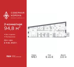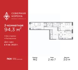 Просторная 2-комн. квартира в ЖК ''Северная корона'' на 2 этаже. Квартира без отделки, новый собственник может сделать ремонт по индивидуальному дизайн-проекту. Общая площадь: 96.8 кв.м., жилая: 36.41 кв.м., площадь просторной кухни-столовой: 32.35 кв.м. Квартира - распашонка, без проходных комнат, окна выходят на paзные стороны дома. В квартире один совмещенный и один раздельный санузел. Высота потолков 3.0 м. Дом монолитный, трехподъездный, высотой 8 этажей. Квартира находится в 1-й секции в корпусе 8.1. На этаже 3 квартиры. В подъезде 1 грузовой лифт. В настоящее время строительство окончено, дом сдан в 4 квартале 2023 года. Оформление сделки по договору купли-продажи. В шаговой доступности от жилого комплекса находятся станции метро (расстояние по прямой): ''Петроградская'' (500 м), ''Чкаловская'' (1.3 км), ''Горьковская'' (1.7 км), ''Чёрная речка'' (1.7 км), также недалеко от этого корпуса расположены станции метро: ''Чернышевская'', ''Спортивная''. Премиальный жилой комплекс ''Северная корона'' расположился в парадной части Петроградской стороны на пересечении ее главного проспекта — Каменноостровского и набережной реки Карповки.Двухсотметровое парадное лобби, дизайнерский ландшафт, собственная фитнес-студия, парадная гостиная для встреч и переговоров, игровой клуб для детей. А также: системы очистки и подготовки воды и воздуха, консьерж-сервис, бесключевой доступ, помещения для ожидания и многое другое.Архитектура премиального дома ''Северная корона'' — это современное воплощение и новое развитие архитектуры северного модерна. Особенность и уникальность дома в его протяженности вдоль реки Карповки. Фасад исключает монотонность, линии интегрированы в канву курдонера и внутренних общественных пространств, обращённых как в сторону Каменноостровского проспекта, так и Иоановского монастыря. Все квартиры в полной мере можно назвать видовыми они открыты историческому окружению и ландшафтной архитектуре. Что дарит владельцам единственные в своем роде захватывающие виды.Этажность: 4 - 9 этажей (в т.ч. 1 подземный)Дом СДАН.Класс проекта: Премиум класс Уникальность проекта:- Французские балконы- Видовые квартиры- Панорамное остекление- Потолки до 3,5 метров- Мансардные окна- Индивидуальные сплит шахты- Считывание номеров автомобилей- Современная архитектура и инженерия- Двор парк- Центральное лобби 200 кв.м. #ZmbTBf