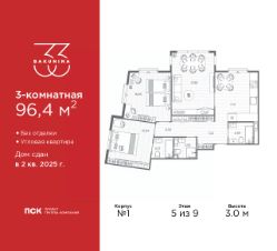 Трехкомнатная квартира от застройщика в ЖК ''BAKUNINA 33'' на 5 этаже. Квартира без отделки, полностью готова к ремонту. Общая площадь: 96.4 кв.м., жилая: 54.65 кв.м., площадь просторной кухни-столовой: 17.11 кв.м. Квартира угловая, идеально подойдет любителям тишины и панорамных видов. В квартире три совмещенных санузла. Высота потолков 3.0 м. Дом монолитный, трехподъездный, высотой 9 этажей. Квартира находится в 1-й секции в корпусе 1. На этаже 7 квартир. В подъезде 1 пассажирский и 1 грузовой лифт. Начало строительства - 2 квартал 2023 года. На сегодняшний день строительство завершено, дом сдан во 2 квартале 2025 года. Оформление сделки по договору купли-продажи. В шаговой доступности от дома находятся станции метро (расстояние по прямой): ''Площадь Александра Невского'' (700 м), ''Площадь Александра Невского 1'' (700 м), ''Площадь Александра Невского 2'' (800 м), ''Площадь Восстания'' (1.4 км), ''Новочеркасская'' (1.5 км), также недалеко от этого корпуса расположены станции метро: ''Владимирская'', ''Чернышевская'', ''Ладожская''. Клубный дом BAKUNINA 33 - новый стандарт престижной жизни в Центральном районе. В 10 минутах от Невского проспекта и в двух минутах от Синопской набережной и Невы, в благоустроенной и знакомой среде. Локация клубного дома Bakunina 33 - идеальное место для погружения в культурную и светскую жизнь Санкт-Петербурга. В 10-15 минутах на машине почти все знаковые достопримечательности города: Эрмитаж, Русский музей, Александринский и Мариинский театры, БДТ, Таврический парк Казанский собор, Спас на крови и другие величественные дворцы, соборы, музеи, ради которых в город ежегодно съезжаются тысячи гостей. Каждая линия и каждый элемент дизайна дома является частью целостной концепции. Облик здания гармоничный, классически сдержанный с выверенными пропорциями и элегантными формами. Цветовые и архитектурные решения и эркеры придают облику дома легкость, доступную лишь респектабельной классике. Фасады привлекают внимание плавными ритмичными переходами. Вертикальная разбивка колоннами визуально устремляет здание ввысь. Плоскость фасадов декорирована разными элементами из гранита. Ограждение балконов, эркеры и колонны дополнены лаконичным геометрическим орнаментом в акцентном теплом сером цвете. Первые два этажа дома облицованы натуральным гранитом тёмного оттенка. Основной объём здания - выполнен штукатурным фасадом с окраской светлыми тонами из цветовой палитры '' Традиционные цвета Санкт-Петербурга''. Верхний этаж выполнен в стиле мансарды с высотой потолков в квартирах 3,5 метра. Этим достигается цель гармоничного и сомасштабного существования в одном фронте с существующими зданиями.За венчающим карнизом располагаются балконы девятого этажа. Ограждения балконов дополнены геометрическими узорами. Закрытый внутренний двор со сквером и детской площадкой. Острова зелени с водной чашей в центре создают ощущение гармонии и умиротворения. Современная уличная мебель и освещение формируют домашнюю атмосферу уюта и представляют