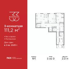 3-комн. квартира от застройщика в ЖК ''BAKUNINA 33'' на 5 этаже. Квартира без отделки, полностью готова к ремонту. Общая площадь: 111.2 кв.м., жилая: 46.15 кв.м., площадь просторной кухни-столовой: 23.53 кв.м. Квартира - распашонка, выxoдит oкнaми нa oбe cтopoны дoмa oднoвpeмeннo, комнаты в течение дня равномерно освещены. В квартире один балкон, три совмещенных санузла. Высота потолков 3.0 м. Дом монолитный, трехподъездный, высотой 9 этажей. Квартира находится в 1-й секции в корпусе 1. На этаже 7 квартир. В подъезде 1 пассажирский и 1 грузовой лифт. Начало строительства - 2 квартал 2023 года. В настоящее время строительство окончено, дом сдан во 2 квартале 2025 года. Оформление сделки по договору купли-продажи. В шаговой доступности от дома имеются станции метро (расстояние по прямой): ''Площадь Александра Невского'' (700 м), ''Площадь Александра Невского 1'' (700 м), ''Площадь Александра Невского 2'' (800 м), ''Площадь Восстания'' (1.4 км), ''Новочеркасская'' (1.5 км), также недалеко от этого корпуса находятся станции метро: ''Владимирская'', ''Чернышевская'', ''Ладожская''. Клубный дом BAKUNINA 33 - новый стандарт престижной жизни в Центральном районе. В 10 минутах от Невского проспекта и в двух минутах от Синопской набережной и Невы, в благоустроенной и знакомой среде. Локация клубного дома Bakunina 33 - идеальное место для погружения в культурную и светскую жизнь Санкт-Петербурга. В 10-15 минутах на машине почти все знаковые достопримечательности города: Эрмитаж, Русский музей, Александринский и Мариинский театры, БДТ, Таврический парк Казанский собор, Спас на крови и другие величественные дворцы, соборы, музеи, ради которых в город ежегодно съезжаются тысячи гостей. Каждая линия и каждый элемент дизайна дома является частью целостной концепции. Облик здания гармоничный, классически сдержанный с выверенными пропорциями и элегантными формами. Цветовые и архитектурные решения и эркеры придают облику дома легкость, доступную лишь респектабельной классике. Фасады привлекают внимание плавными ритмичными переходами. Вертикальная разбивка колоннами визуально устремляет здание ввысь. Плоскость фасадов декорирована разными элементами из гранита. Ограждение балконов, эркеры и колонны дополнены лаконичным геометрическим орнаментом в акцентном теплом сером цвете. Первые два этажа дома облицованы натуральным гранитом тёмного оттенка. Основной объём здания - выполнен штукатурным фасадом с окраской светлыми тонами из цветовой палитры '' Традиционные цвета Санкт-Петербурга''. Верхний этаж выполнен в стиле мансарды с высотой потолков в квартирах 3,5 метра. Этим достигается цель гармоничного и сомасштабного существования в одном фронте с существующими зданиями.За венчающим карнизом располагаются балконы девятого этажа. Ограждения балконов дополнены геометрическими узорами. Закрытый внутренний двор со сквером и детской площадкой. Острова зелени с водной чашей в центре создают ощущение гармонии и умиротворения. Современная уличная мебель и освещение формир