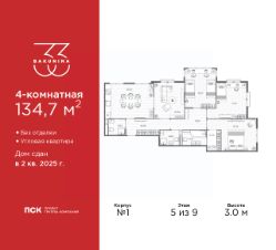 4-комн. квартира от застройщика в ЖК ''BAKUNINA 33'' на 5 этаже. Квартира без отделки, после оформления собственности можно делать ремонт. Общая площадь: 134.7 кв.м., жилая: 72.03 кв.м., площадь просторной кухни-столовой: 25.21 кв.м. Угловая квартира, очень светлая, естественная вентиляция при открытии окон. В квартире три совмещенных санузла. Высота потолков 3.0 м. Дом монолитный, трехподъездный, высотой 9 этажей. Квартира находится во 2-й секции в корпусе 1. На этаже 5 квартир. В подъезде 1 пассажирский и 1 грузовой лифт. Начало строительства - 2 квартал 2023 года. В настоящее время строительство завершено, дом сдан во 2 квартале 2025 года. Оформление сделки по договору купли-продажи. В шаговой доступности от дома расположены станции метро (расстояние по прямой): ''Площадь Александра Невского'' (700 м), ''Площадь Александра Невского 1'' (700 м), ''Площадь Александра Невского 2'' (800 м), ''Площадь Восстания'' (1.4 км), ''Новочеркасская'' (1.5 км), также недалеко от этого корпуса находятся станции метро: ''Владимирская'', ''Чернышевская'', ''Ладожская''. Клубный дом BAKUNINA 33 - новый стандарт престижной жизни в Центральном районе. В 10 минутах от Невского проспекта и в двух минутах от Синопской набережной и Невы, в благоустроенной и знакомой среде. Локация клубного дома Bakunina 33 - идеальное место для погружения в культурную и светскую жизнь Санкт-Петербурга. В 10-15 минутах на машине почти все знаковые достопримечательности города: Эрмитаж, Русский музей, Александринский и Мариинский театры, БДТ, Таврический парк Казанский собор, Спас на крови и другие величественные дворцы, соборы, музеи, ради которых в город ежегодно съезжаются тысячи гостей. Каждая линия и каждый элемент дизайна дома является частью целостной концепции. Облик здания гармоничный, классически сдержанный с выверенными пропорциями и элегантными формами. Цветовые и архитектурные решения и эркеры придают облику дома легкость, доступную лишь респектабельной классике. Фасады привлекают внимание плавными ритмичными переходами. Вертикальная разбивка колоннами визуально устремляет здание ввысь. Плоскость фасадов декорирована разными элементами из гранита. Ограждение балконов, эркеры и колонны дополнены лаконичным геометрическим орнаментом в акцентном теплом сером цвете. Первые два этажа дома облицованы натуральным гранитом тёмного оттенка. Основной объём здания - выполнен штукатурным фасадом с окраской светлыми тонами из цветовой палитры '' Традиционные цвета Санкт-Петербурга''. Верхний этаж выполнен в стиле мансарды с высотой потолков в квартирах 3,5 метра. Этим достигается цель гармоничного и сомасштабного существования в одном фронте с существующими зданиями.За венчающим карнизом располагаются балконы девятого этажа. Ограждения балконов дополнены геометрическими узорами. Закрытый внутренний двор со сквером и детской площадкой. Острова зелени с водной чашей в центре создают ощущение гармонии и умиротворения. Современная уличная мебель и освещение формируют домашнюю атмосферу