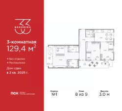 Продается 3-комн. квартира в ЖК ''BAKUNINA 33'' на 8 этаже. Квартира без отделки, полностью готова к ремонту. Общая площадь: 129.4 кв.м., жилая: 60.78 кв.м., площадь просторной кухни-столовой: 15.85 кв.м. Квартира - распашонка, без проходных комнат, окна выходят на paзные стороны дома. В квартире два балкона, два совмещенных санузла. Наличие террасы в квартире открывает возможность для обустройства дополнительной площади. Высота потолков 3.0 м. Дом монолитный, трехподъездный, высотой 9 этажей. Квартира находится в 1-й секции в корпусе 1. На этаже 7 квартир. В подъезде 1 пассажирский и 1 грузовой лифт. Начало строительства - 2 квартал 2023 года. На сегодняшний день строительство завершено, дом сдан во 2 квартале 2025 года. Оформление сделки по договору купли-продажи. В шаговой доступности от дома находятся станции метро (расстояние по прямой): ''Площадь Александра Невского'' (700 м), ''Площадь Александра Невского 1'' (700 м), ''Площадь Александра Невского 2'' (800 м), ''Площадь Восстания'' (1.4 км), ''Новочеркасская'' (1.5 км), также недалеко от этого корпуса расположены станции метро: ''Владимирская'', ''Чернышевская'', ''Ладожская''. Клубный дом BAKUNINA 33 - новый стандарт престижной жизни в Центральном районе. В 10 минутах от Невского проспекта и в двух минутах от Синопской набережной и Невы, в благоустроенной и знакомой среде. Локация клубного дома Bakunina 33 - идеальное место для погружения в культурную и светскую жизнь Санкт-Петербурга. В 10-15 минутах на машине почти все знаковые достопримечательности города: Эрмитаж, Русский музей, Александринский и Мариинский театры, БДТ, Таврический парк Казанский собор, Спас на крови и другие величественные дворцы, соборы, музеи, ради которых в город ежегодно съезжаются тысячи гостей. Каждая линия и каждый элемент дизайна дома является частью целостной концепции. Облик здания гармоничный, классически сдержанный с выверенными пропорциями и элегантными формами. Цветовые и архитектурные решения и эркеры придают облику дома легкость, доступную лишь респектабельной классике. Фасады привлекают внимание плавными ритмичными переходами. Вертикальная разбивка колоннами визуально устремляет здание ввысь. Плоскость фасадов декорирована разными элементами из гранита. Ограждение балконов, эркеры и колонны дополнены лаконичным геометрическим орнаментом в акцентном теплом сером цвете. Первые два этажа дома облицованы натуральным гранитом тёмного оттенка. Основной объём здания - выполнен штукатурным фасадом с окраской светлыми тонами из цветовой палитры '' Традиционные цвета Санкт-Петербурга''. Верхний этаж выполнен в стиле мансарды с высотой потолков в квартирах 3,5 метра. Этим достигается цель гармоничного и сомасштабного существования в одном фронте с существующими зданиями.За венчающим карнизом располагаются балконы девятого этажа. Ограждения балконов дополнены геометрическими узорами. Закрытый внутренний двор со сквером и детской площадкой. Острова зелени с водной чашей в центре создают ощущение гармонии и у