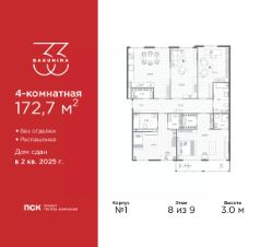 4-комн. квартира от застройщика в ЖК ''BAKUNINA 33'' на 8 этаже. Квартира без отделки, полностью готова к чистовой отделке и дальнейшему ремонту. Общая площадь: 172.7 кв.м., жилая: 95.7 кв.м., площадь просторной кухни-столовой: 29.32 кв.м. Квартира - распашонка, без проходных комнат, окна выходят на paзные стороны дома. В квартире один балкон, три совмещенных санузла. Высота потолков 3.0 м. Дом монолитный, трехподъездный, высотой 9 этажей. Квартира находится в 1-й секции в корпусе 1. На этаже 7 квартир. В подъезде 1 пассажирский и 1 грузовой лифт. Начало строительства - 2 квартал 2023 года. Строительство окончено, дом сдан во 2 квартале 2025 года. Оформление сделки по договору купли-продажи. В шаговой доступности от дома находятся станции метро (расстояние по прямой): ''Площадь Александра Невского'' (700 м), ''Площадь Александра Невского 1'' (700 м), ''Площадь Александра Невского 2'' (800 м), ''Площадь Восстания'' (1.4 км), ''Новочеркасская'' (1.5 км), также недалеко от этого корпуса расположены станции метро: ''Владимирская'', ''Чернышевская'', ''Ладожская''. Клубный дом BAKUNINA 33 - новый стандарт престижной жизни в Центральном районе. В 10 минутах от Невского проспекта и в двух минутах от Синопской набережной и Невы, в благоустроенной и знакомой среде. Локация клубного дома Bakunina 33 - идеальное место для погружения в культурную и светскую жизнь Санкт-Петербурга. В 10-15 минутах на машине почти все знаковые достопримечательности города: Эрмитаж, Русский музей, Александринский и Мариинский театры, БДТ, Таврический парк Казанский собор, Спас на крови и другие величественные дворцы, соборы, музеи, ради которых в город ежегодно съезжаются тысячи гостей. Каждая линия и каждый элемент дизайна дома является частью целостной концепции. Облик здания гармоничный, классически сдержанный с выверенными пропорциями и элегантными формами. Цветовые и архитектурные решения и эркеры придают облику дома легкость, доступную лишь респектабельной классике. Фасады привлекают внимание плавными ритмичными переходами. Вертикальная разбивка колоннами визуально устремляет здание ввысь. Плоскость фасадов декорирована разными элементами из гранита. Ограждение балконов, эркеры и колонны дополнены лаконичным геометрическим орнаментом в акцентном теплом сером цвете. Первые два этажа дома облицованы натуральным гранитом тёмного оттенка. Основной объём здания - выполнен штукатурным фасадом с окраской светлыми тонами из цветовой палитры '' Традиционные цвета Санкт-Петербурга''. Верхний этаж выполнен в стиле мансарды с высотой потолков в квартирах 3,5 метра. Этим достигается цель гармоничного и сомасштабного существования в одном фронте с существующими зданиями.За венчающим карнизом располагаются балконы девятого этажа. Ограждения балконов дополнены геометрическими узорами. Закрытый внутренний двор со сквером и детской площадкой. Острова зелени с водной чашей в центре создают ощущение гармонии и умиротворения. Современная уличная мебель и освещение формируют домашнюю атмо