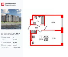 Продается просторная 1-комнатная квартира от застройщика в жилом комплексе ''Setl Ривьера'' в активно развивающимся Невском районе.До метро можно добраться на транспорте всего за 10 минут.Удобная, классическая, функциональная европланировка, большая кухня-гостиная 17.06 м², вместительная прихожая 3.68 м². Общая площадь квартиры - 34.89 м², жилая 10.04 м², высота потолка 2.77 м.Квартира продается с отделкой ''NORD LINE WHITE ВК NEW''.Что особенного в ЖК ''Setl Ривьера''?• Первая береговая линия Невы. 5 км до центра Петербурга• ''Активити парк'' - пространство для занятий спортом и отдыха. ''Ривьера парк'' с променадом и панорамной ротондой• Масштабные дворы 10 000 кв.м. с авторским ландшафтным дизайном• Двухуровневые единые входные группы• Видовые квартиры с террасами, каминами и саунами
