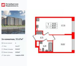 Продается просторная 1-комнатная квартира от застройщика в жилом комплексе ''Setl Ривьера'' в активно развивающимся Невском районе.До метро можно добраться на транспорте всего за 10 минут.Удобная, классическая, функциональная европланировка, большая кухня-гостиная 17.73 м², вместительная прихожая 3.72 м². Общая площадь квартиры - 35.67 м², жилая 10.02 м², высота потолка 2.77 м.Квартира продается с отделкой ''NORD LINE SILVER ВК NEW''.Что особенного в ЖК ''Setl Ривьера''?• Первая береговая линия Невы. 5 км до центра Петербурга• ''Активити парк'' - пространство для занятий спортом и отдыха. ''Ривьера парк'' с променадом и панорамной ротондой• Масштабные дворы 10 000 кв.м. с авторским ландшафтным дизайном• Двухуровневые единые входные группы• Видовые квартиры с террасами, каминами и саунами