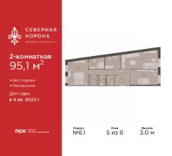 Продается 2-комн. квартира в ЖК ''Северная корона'' на 6 этаже. Квартира без отделки, новый владелец может сделать ремонт по своему дизайн-проекту. Общая площадь: 94.8 кв.м., жилая: 34.7 кв.м., площадь просторной кухни-столовой: 23.04 кв.м. Квартира - распашонка, без проходных комнат, окна выходят на paзные стороны дома. В квартире два совмещенных и один раздельный санузел. Высота потолков 3.0 м. Дом монолитный, трехподъездный, высотой 8 этажей. Квартира находится в 1-й секции в корпусе 8.1. На этаже 3 квартиры. В подъезде 1 грузовой лифт. В настоящее время строительство завершено, дом сдан в 4 квартале 2023 года. Оформление сделки по договору купли-продажи. В шаговой доступности от жилого комплекса находятся станции метро (расстояние по прямой): ''Петроградская'' (500 м), ''Чкаловская'' (1.3 км), ''Горьковская'' (1.7 км), ''Чёрная речка'' (1.7 км), также недалеко от этого корпуса находятся станции метро: ''Чернышевская'', ''Спортивная''. Премиальный жилой комплекс ''Северная корона'' расположился в парадной части Петроградской стороны на пересечении ее главного проспекта — Каменноостровского и набережной реки Карповки.Двухсотметровое парадное лобби, дизайнерский ландшафт, собственная фитнес-студия, парадная гостиная для встреч и переговоров, игровой клуб для детей. А также: системы очистки и подготовки воды и воздуха, консьерж-сервис, бесключевой доступ, помещения для ожидания и многое другое.Архитектура премиального дома ''Северная корона'' — это современное воплощение и новое развитие архитектуры северного модерна. Особенность и уникальность дома в его протяженности вдоль реки Карповки. Фасад исключает монотонность, линии интегрированы в канву курдонера и внутренних общественных пространств, обращённых как в сторону Каменноостровского проспекта, так и Иоановского монастыря. Все квартиры в полной мере можно назвать видовыми они открыты историческому окружению и ландшафтной архитектуре. Что дарит владельцам единственные в своем роде захватывающие виды.Этажность: 4 - 9 этажей (в т.ч. 1 подземный)Дом СДАН.Класс проекта: Премиум класс Уникальность проекта:- Французские балконы- Видовые квартиры- Панорамное остекление- Потолки до 3,5 метров- Мансардные окна- Индивидуальные сплит шахты- Считывание номеров автомобилей- Современная архитектура и инженерия- Двор парк- Центральное лобби 200 кв.м. #ZMbtc0