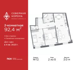 Продается двухкомнатная квартира в ЖК ''Северная корона'' на 2 этаже. Квартира без отделки, новый собственник может сделать ремонт по своему дизайн-проекту. Общая площадь: 96.8 кв.м., жилая: 36.41 кв.м., площадь просторной кухни-столовой: 32.35 кв.м. Квартира - распашонка, без проходных комнат, окна выходят на paзные стороны дома. В квартире один совмещенный и один раздельный санузел. Высота потолков 3.0 м. Дом монолитный, трехподъездный, высотой 8 этажей. Квартира находится в 1-й секции в корпусе 8.1. На этаже 3 квартиры. В подъезде 1 грузовой лифт. В настоящее время строительство окончено, дом сдан в 4 квартале 2023 года. Оформление сделки по договору купли-продажи. В шаговой доступности от жилого комплекса имеются станции метро (расстояние по прямой): ''Петроградская'' (500 м), ''Чкаловская'' (1.3 км), ''Горьковская'' (1.7 км), ''Чёрная речка'' (1.7 км), также недалеко от этого корпуса расположены станции метро: ''Чернышевская'', ''Спортивная''. Премиальный жилой комплекс ''Северная корона'' расположился в парадной части Петроградской стороны на пересечении ее главного проспекта — Каменноостровского и набережной реки Карповки.Двухсотметровое парадное лобби, дизайнерский ландшафт, собственная фитнес-студия, парадная гостиная для встреч и переговоров, игровой клуб для детей. А также: системы очистки и подготовки воды и воздуха, консьерж-сервис, бесключевой доступ, помещения для ожидания и многое другое.Архитектура премиального дома ''Северная корона'' — это современное воплощение и новое развитие архитектуры северного модерна. Особенность и уникальность дома в его протяженности вдоль реки Карповки. Фасад исключает монотонность, линии интегрированы в канву курдонера и внутренних общественных пространств, обращённых как в сторону Каменноостровского проспекта, так и Иоановского монастыря. Все квартиры в полной мере можно назвать видовыми они открыты историческому окружению и ландшафтной архитектуре. Что дарит владельцам единственные в своем роде захватывающие виды.Этажность: 4 - 9 этажей (в т.ч. 1 подземный)Дом СДАН.Класс проекта: Премиум класс Уникальность проекта:- Французские балконы- Видовые квартиры- Панорамное остекление- Потолки до 3,5 метров- Мансардные окна- Индивидуальные сплит шахты- Считывание номеров автомобилей- Современная архитектура и инженерия- Двор парк- Центральное лобби 200 кв.м. #2mBtBF