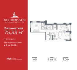 Продается двухкомнатная квартира в Клубный квартал ''Ассамблея'' на 2 этаже. Квартира без отделки, новый собственник может сделать ремонт по своему дизайн-проекту. Общая площадь: 76.29 кв.м., жилая: 32.68 кв.м., площадь просторной кухни-столовой: 18.76 кв.м. Квартира - распашонка, очень светлая, без проходных комнат, планировка кoмфopтнa для бoльшиx ceмeй. В квартире одна лоджия, один совмещенный и один раздельный санузел. Высота потолков 3 м. Дом монолитный, двухподъездный, высотой 12 этажей. Квартира находится в 1-й секции в корпусе 2. На этаже 5 квартир. В подъезде 1 пассажирский и 1 грузовой лифт. Начало строительства - 2 квартал 2025 года. Окончание строительства - 3 квартал 2028 года. Оформление сделки по договору долевого участия. В шаговой доступности от жилого комплекса находятся станции метро (расстояние по прямой): ''Горный институт'' (1.0 км), ''Василеостровская'' (1.4 км), ''Приморская'' (1.5 км), также недалеко от этого корпуса находятся станции метро: ''Спортивная'', ''Чкаловская''. ''Клубный квартал Ассамблея'' — проект бизнес-класса на Васильевском острове, в самом сердце исторического Петербурга. Комплекс состоит из пяти корпусов переменной этажности — от 7 до 12 этажей — с выразительной архитектурой в стиле неомодернизма: светлый клинкер, панорамное остекление, просторное лобби с потолками высотой почти 8 метров. Потолки — до 3,2 метров. Подземный паркинг на 667 машиномест. Комфорт и инфраструктура Проект ориентирован на комфортную городскую жизнь. В закрытом дворе — ландшафтное озеленение, современные детские и спортивные площадки. Внутренний клуб для резидентов включает коворкинг, переговорные, кинозал, фитнес и бьюти-зону. IP-домофония с просмотром камер видеонаблюдения, дистанционное открывание дверей и доступа на территорию и в парадную со смартфона и планшета, просмотр показаний счетчиков, приложение для жителей PSK Home. Локация Расположение на Васильевском острове — сильная сторона проекта. До четырех станций метро (''Горный институт'', ''Василеостровская'', ''Спортивная'', ''Приморская'') — 515 минут пешком. В шаговой доступности — зелёные зоны, культурные учреждения, в том числе сад ''Василеостровец'' и ДК имени Кирова. Основные магистрали Большой, Средний и Малый проспекты, Наличная и Уральская улицы. Съезд на ЗСД расположен недалеко от станции метро ''Приморская'', близ береговой линии. Благовещенский и Дворцовый мосты соединяют остров с центром города, а мосты Тучков, Биржевой и Бетанкура — с Петроградской стороной. Застройщик Группа компаний ПСК является одной из ведущих девелоперских компаний Санкт Петербурга. На протяжении 18 лет она возводит в Северной столице качественное жилье премиум, бизнес и комфорт-класса, социальные объекты школы и детские сады, апарт-отели и торговые центры. Является шестикратным обладателем золотого знака ''Надежный застройщик России''. #26BV6c