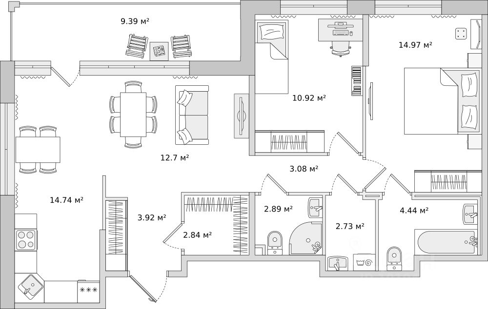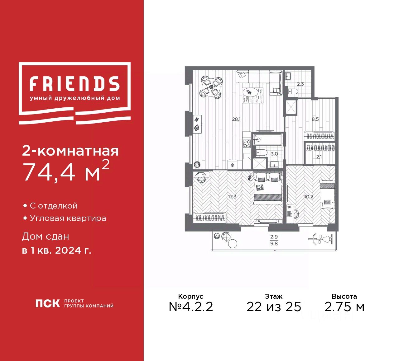 Просторная 2-комн. квартира с отделкой в ЖК ''Friends'' на 22 этаже. Общая площадь: 74.4 кв.м., жилая: 27.4 кв.м., площадь просторной кухни-столовой: 28.1 кв.м. Угловая квартира, очень светлая, естественная вентиляция при открытии окон. В квартире один балкон, один совмещенный и один раздельный санузел. Наличие в квартире террасы площадью 9.8 кв.м. дает возможность для создания зон отдыха в кругу семьи и друзей. Высота потолков 2.75 м. Эта квартира представлена с чистовой отделкой. В ЖК Friends есть квартиры без отделки, квартиры с предчистовой отделкой (White Box) и с чистовой отделкой в двух вариантах: светлая и тёмная. Квартира находится в корпусе 4.2.2. Дом монолитный, одноподъездный, высотой 25 этажей. На этаже 10 квартир. В подъезде 2 пассажирских и 1 грузовой лифт. На сегодняшний день строительство окончено, дом сдан в 1 квартале 2024 года. Оформление сделки по договору купли-продажи. На оставшиеся квартиры ''Семейная ипотека'' не распространяется. FRIENDS новый жилой комплекс комфорт-класса в Приморском районе рядом с Новоорловским заказником и Суздальскими озерами. Из квартир открываются живописные виды. Протяженность границы зеленой зоны в этой части более 1,3 км, вдоль нее протекает река Каменка, а также в шаговой доступности находятся несколько озёр. ЖК FRIENDS отделен от жилой застройки территорией школьного стадиона и спортивными площадками. 100 150 метров до школы 632 и двух детских садов. Двор ЖК Friends — полноценная территория для активного или спокойного отдыха. Детские игровые зоны и площадки для отдыха взрослых, зоны для катания на роликах и две площадки для воркаута. Предусмотрены велопарковки у парадных. Социальная инфраструктура: школа, ДС, магазины, рядом крупные ТЦ, гипермаркеты, спортивные клубы. - Умные планировки - вы можете сделать функциональным каждый метр. - Многоуровневый 7 этажный паркинг - IP домофония с установкой конечного устройства (панели) в квартире. Видеонаблюдение на придомовой территории с возможностью трансляции на домофон/приложение. Современный СКУД - Дистанционный сбор показаний счетчиков (вода, тепло, электричество) - Горизонтальная разводка отопления - Места для установки кондиционеров на балконах. ЖК находится в 15 минутах на транспорте от станции метро ''Проспект Просвещения'', ''Озерки'' и ''Парнас''. Выезд из микрорайона на Суздальское шоссе 2 минуты на транспорте или пешком 5 10 минут. Варианты оплаты: - Ипотека: ГК ''ПСК'' аккредитован ведущими банками. - Рассрочка от застройщика на выгодных условиях. - Материнский капитал - Trade-in в зачет старой недвижимости. Надежный застройщик ГК ''ПСК''. Все объекты сдает в срок. Рейтинг на ЕРЗ максимальный 5 баллов. Аккредитация в банках: ПАО Банк ''ВТБ'', ''Сбербанк России'', ПАО АКБ ''Металлинвестбанк'', ПАО ''Совкомбанк'', АО ''ДОМ.РФ''. #Z4WdsB
