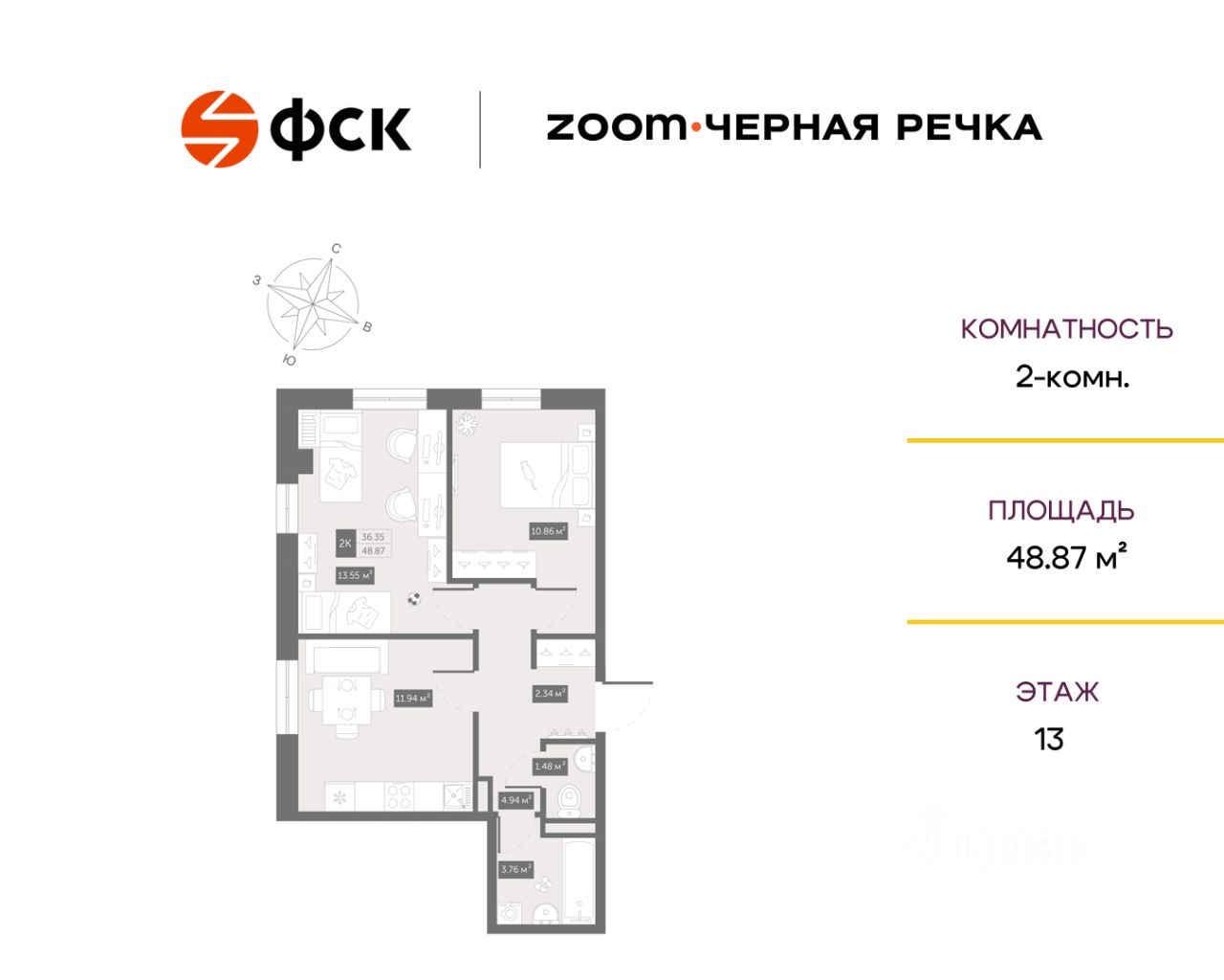 48 м² · Этаж 13 из 13