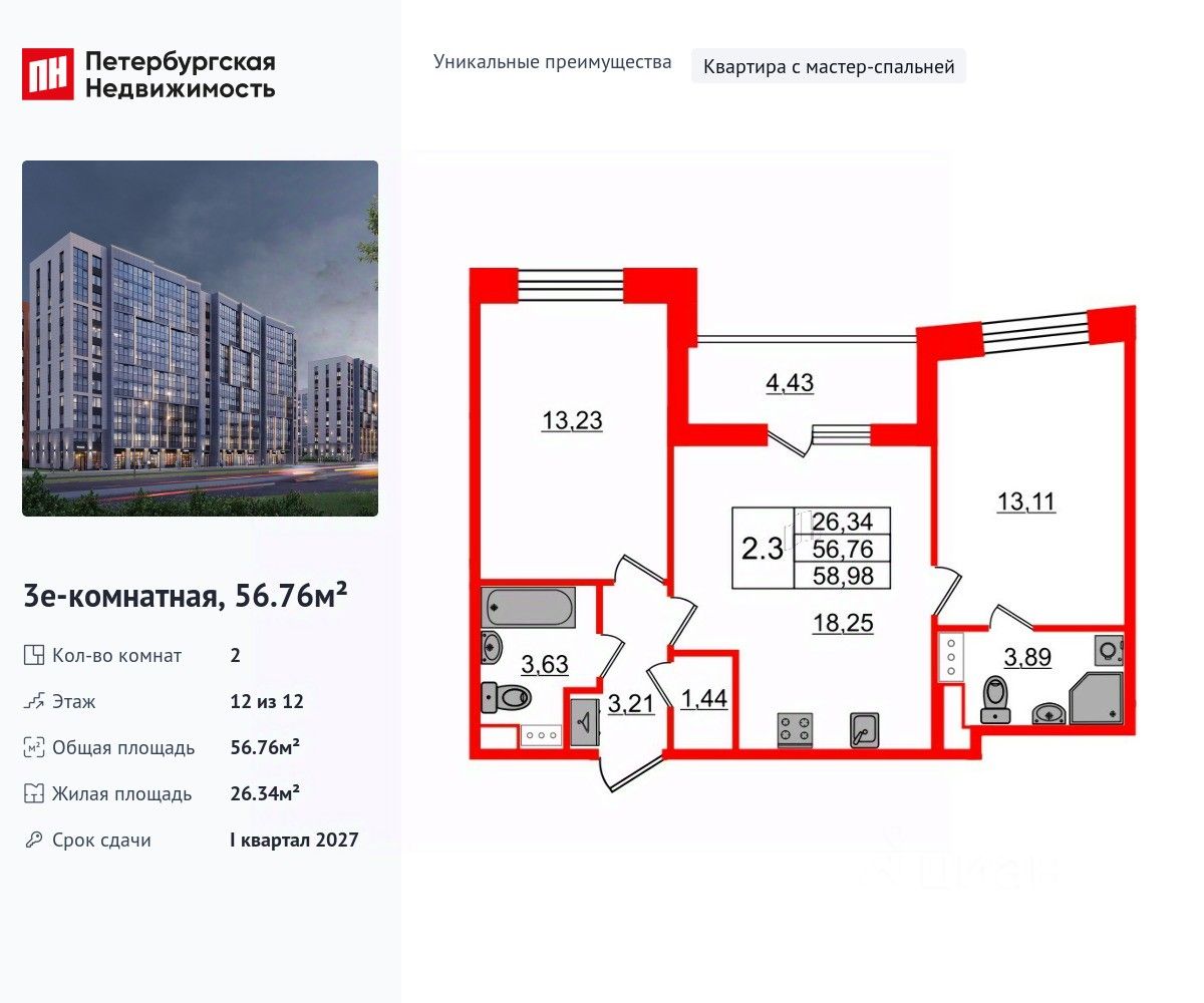Продается уютная 2-комнатная квартира от застройщика в жилом комплексе ''Бионика Заповедная'' в динамичном Приморском районе. До метро можно добраться на транспорте всего за 11 минут. Мастер-спальня с собственной ванной комнатой. Самое приватное пространство в вашей квартире. Уникальная, функциональная европланировка, большая кухня-гостиная 18.25 м², вместительная прихожая 3.21 м². Общая площадь квартиры - 56.76 м², жилая 26.34 м², высота потолка 3 м. Квартира продается с отделкой ''Норд Лайн светлый плюс''. Что особенного в ЖК ''Бионика Заповедная''? • Оазис в городе 3 минуты пешком до Новоорловского заказника (140 ГА) • Захватывающие виды из окон на хвойный лесопарк • Всесезонный ''Заповедный парк'' во дворе площадью 23000 кв.м. • 5 единых входных групп с авторским дизайном и лаундж-зонами, сити-виллы на первых этажах с палисадниками и высотой потолков до 4 м • Места притяжения: фонтан ''Бионика'', спортивный кластер со скейт-парком, фотозоны с арт-объектами