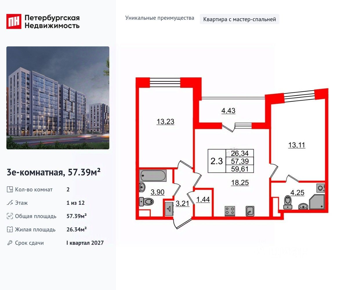 Продается уютная 2-комнатная квартира от застройщика в жилом комплексе ''Бионика Заповедная'' в динамичном Приморском районе. До метро можно добраться на транспорте всего за 11 минут. Мастер-спальня с собственной ванной комнатой. Самое приватное пространство в вашей квартире. Уникальная, функциональная европланировка, большая кухня-гостиная 18.25 м², вместительная прихожая 3.21 м². Общая площадь квартиры - 57.39 м², жилая 26.34 м², высота потолка 2.77 м. Квартира продается с отделкой ''Норд Лайн светлый плюс''. Что особенного в ЖК ''Бионика Заповедная''? • Оазис в городе 3 минуты пешком до Новоорловского заказника (140 ГА) • Захватывающие виды из окон на хвойный лесопарк • Всесезонный ''Заповедный парк'' во дворе площадью 23000 кв.м. • 5 единых входных групп с авторским дизайном и лаундж-зонами, сити-виллы на первых этажах с палисадниками и высотой потолков до 4 м • Места притяжения: фонтан ''Бионика'', спортивный кластер со скейт-парком, фотозоны с арт-объектами