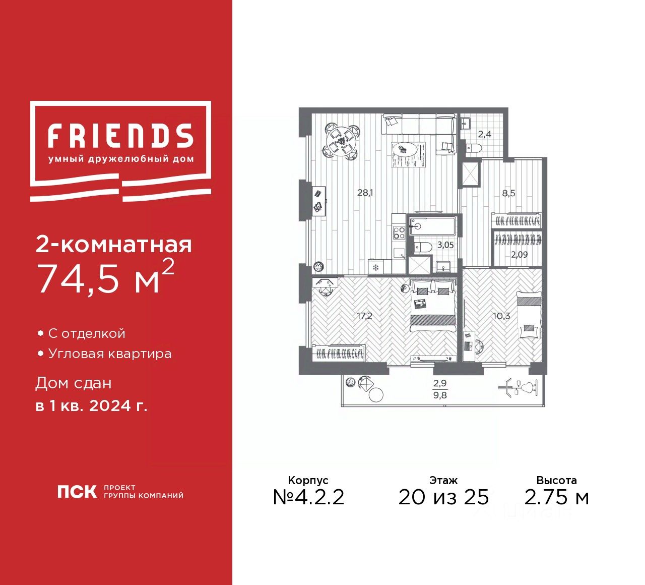 Двухкомнатная квартира от застройщика с отделкой в ЖК ''Friends'' на 20 этаже. Общая площадь: 74.5 кв.м., жилая: 27.5 кв.м., площадь просторной кухни-столовой: 28.1 кв.м. Угловая квартира, окна oбecпeчивaют paвнoмepнoe ocвeщeниe в тeчeниe дня. В квартире один балкон, один совмещенный и один раздельный санузел. Наличие в квартире террасы площадью 9.8 кв.м. дает возможность для обустройства дополнительной площади. Высота потолков 2.75 м. Эта квартира представлена с чистовой отделкой. В ЖК Friends есть квартиры без отделки, квартиры с предчистовой отделкой (White Box) и с чистовой отделкой в двух вариантах: светлая и тёмная. Квартира находится в корпусе 4.2.2. Дом монолитный, одноподъездный, высотой 25 этажей. На этаже 10 квартир. В подъезде 2 пассажирских и 1 грузовой лифт. Строительство завершено, дом сдан в 1 квартале 2024 года. Оформление сделки по договору купли-продажи. На оставшиеся квартиры ''Семейная ипотека'' не распространяется. FRIENDS новый жилой комплекс комфорт-класса в Приморском районе рядом с Новоорловским заказником и Суздальскими озерами. Из квартир открываются живописные виды. Протяженность границы зеленой зоны в этой части более 1,3 км, вдоль нее протекает река Каменка, а также в шаговой доступности находятся несколько озёр. ЖК FRIENDS отделен от жилой застройки территорией школьного стадиона и спортивными площадками. 100 150 метров до школы 632 и двух детских садов. Двор ЖК Friends — полноценная территория для активного или спокойного отдыха. Детские игровые зоны и площадки для отдыха взрослых, зоны для катания на роликах и две площадки для воркаута. Предусмотрены велопарковки у парадных. Социальная инфраструктура: школа, ДС, магазины, рядом крупные ТЦ, гипермаркеты, спортивные клубы. - Умные планировки - вы можете сделать функциональным каждый метр. - Многоуровневый 7 этажный паркинг - IP домофония с установкой конечного устройства (панели) в квартире. Видеонаблюдение на придомовой территории с возможностью трансляции на домофон/приложение. Современный СКУД - Дистанционный сбор показаний счетчиков (вода, тепло, электричество) - Горизонтальная разводка отопления - Места для установки кондиционеров на балконах. ЖК находится в 15 минутах на транспорте от станции метро ''Проспект Просвещения'', ''Озерки'' и ''Парнас''. Выезд из микрорайона на Суздальское шоссе 2 минуты на транспорте или пешком 5 10 минут. Варианты оплаты: - Ипотека: ГК ''ПСК'' аккредитован ведущими банками. - Рассрочка от застройщика на выгодных условиях. - Материнский капитал - Trade-in в зачет старой недвижимости. Надежный застройщик ГК ''ПСК''. Все объекты сдает в срок. Рейтинг на ЕРЗ максимальный 5 баллов. Аккредитация в банках: ''Сбербанк России'', ПАО Банк ''ВТБ'', АО ''ДОМ.РФ'', ПАО АКБ ''Металлинвестбанк'', ПАО ''Совкомбанк''. #24wdsV