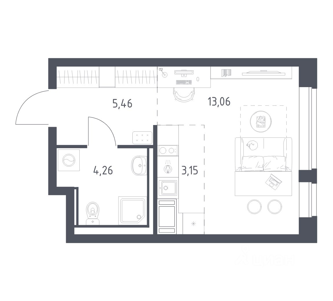 Предлагается квартира студия комфорт-класса 25,93 кв.м в корпусе 35.1 на 9 этаже, в ЖК ''Новое Колпино'' Квартира с предчистовой отделкой. Доступность дополнительных опций уточняйте на сайте застройщика. Планировкой предусмотрены: Прихожая - 5,46 м² Кухня-ниша - 3,15 м² Студия - 13,06 м² СУ - 4,26 м² Приобрести квартиру возможно по специальным акциям от застройщика, с текущими условиями акций можно ознакомиться в блоке Акций. Цена динамическая и может отличаться, уточняйте актуальность у застройщика. Квартал ''Новое Колпино'' — современный квартал в тихом и зеленом районе Санкт-Петербурга. Здесь можно подолгу любоваться пышными кронами деревьев, подставляя лицо теплым лучам солнца. А еще в любой момент можно сесть в машину и уже через час оказаться в сердце Северной столицы. Будет легко планировать поездки: до центра Петербурга, или площади Восстания, — 25 минут на поезде. С территории квартала удобно выезжать на крупные магистрали: путь до Южного шоссе займет 15 минут на авто, а до Петрозаводского шоссе — всего 6 минут. В 20 минутах на авто находится метро ''Рыбацкое'', а в 7 минутах — ж/д станция Колпино. Проводите выходные на природе в Колпинском парке, который находится недалеко от квартала, на берегу реки Ижоры. Летом здесь можно вместе с детьми веселиться на аттракционах, кататься на лодке, играть в бадминтон или волейбол. А еще можно захватить орехов и покормить белок. Всего 7 минут на авто или автобусе — и вы в центре города Колпино. Взрослых впечатлит русская архитектура старинных церквей, а детям понравится забавный памятник героям мультфильма ''Трое из Простоквашино''. В ''Новом Колпино'' будут работать 4 детских сада, 3 из них уже готовы встречать малышей. Ребята постарше могут ходить на занятия в школу с собственным бассейном, в проекте уже работает новая современная школа с бассейном Корпуса высотой 11 этажей с французскими и панорамными балконами отделаны штукатуркой и облицовочным кирпичом. Вдохновение для палитры нам подарили оттенки рассветного неба: терракотовый, персиковый, песочный. Во дворе найдется интересное занятие для всех жителей квартала. Взрослые смогут устраивать тренировки на свежем воздухе в спортивных зонах, дети будут целый день веселиться на игровых площадках. А еще мы позаботились о вашей безопасности и закрыли дворы от машин. Возвращайтесь домой с чемоданом из путешествия или коляской из парка. На пути в подъезд вы не встретите ступенек. Оставить транспорт можно будет в специальном помещении на первом этаже. По желанию вы сможете получить ключи от квартиры с готовой отделкой. Мы положим ламинат, поклеим обои, установим мебель и сантехнику. Доступен вариант с готовой кухней — бежевые тона отделки станут фоном для интерьера мечты. Чтобы сразу отпраздновать новоселье, закажите у нас декор и мебельные сеты. А если хочется воплотить собственные идеи в интерьере, присмотритесь к опции — без отделки.